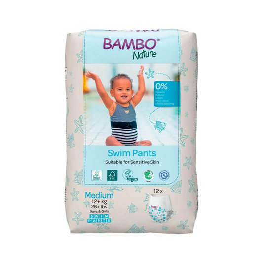 Los pañales desechables para agua Bambo Nature tienen un ajuste suave y elástico alrededor de la cintura, brindando a tu bebé una experiencia súper cómoda y flexible. Diseñados para su uso en el agua con doble barrera contra fugas para mantener el agua limpia y libre de accidentes. Cambiar el pañal mojado es fácil rasgando el elástico por los costados. Los pañales para agua están dermatológicamente probados y certificados.