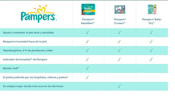 Tanto si tienes un recién nacido, un niño pequeño o un niño grande que necesita un pequeño apoyo adicional para mantenerse seco durante la noche, nuestros paquetes de pañales y toallitas para bebé ofrecen opciones para satisfacer las necesidades de cada niño. También contamos con herramientas útiles que te ayudarán a encontrar el pañal perfecto en la medida en que tu bebé evoluciona y crece. Por ejemplo, podemos ayudarte a escoger el tamaño del pañal de acuerdo con el peso del bebé. O puedes utilizar nuestra herramienta de comparación para ver con facilidad la diferencia entre todos los pañales Pampers.