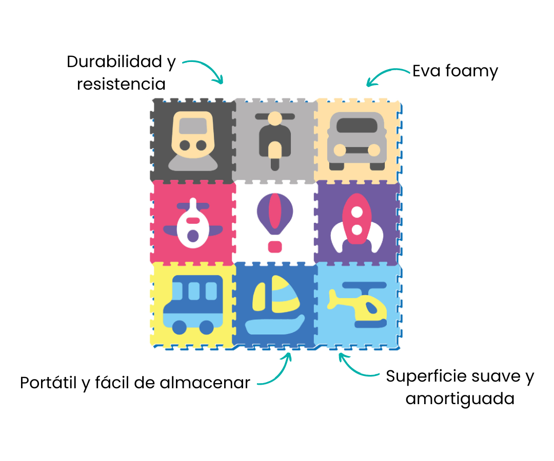 Fabricada con eva foamy, garantiza durabilidad, proporcionando un entorno seguro para que tu hijo juegue. Con piezas entrelazadas, ofrece la posibilidad de crear estructuras mientras desarrolla habilidades motoras y estimula su imaginación.