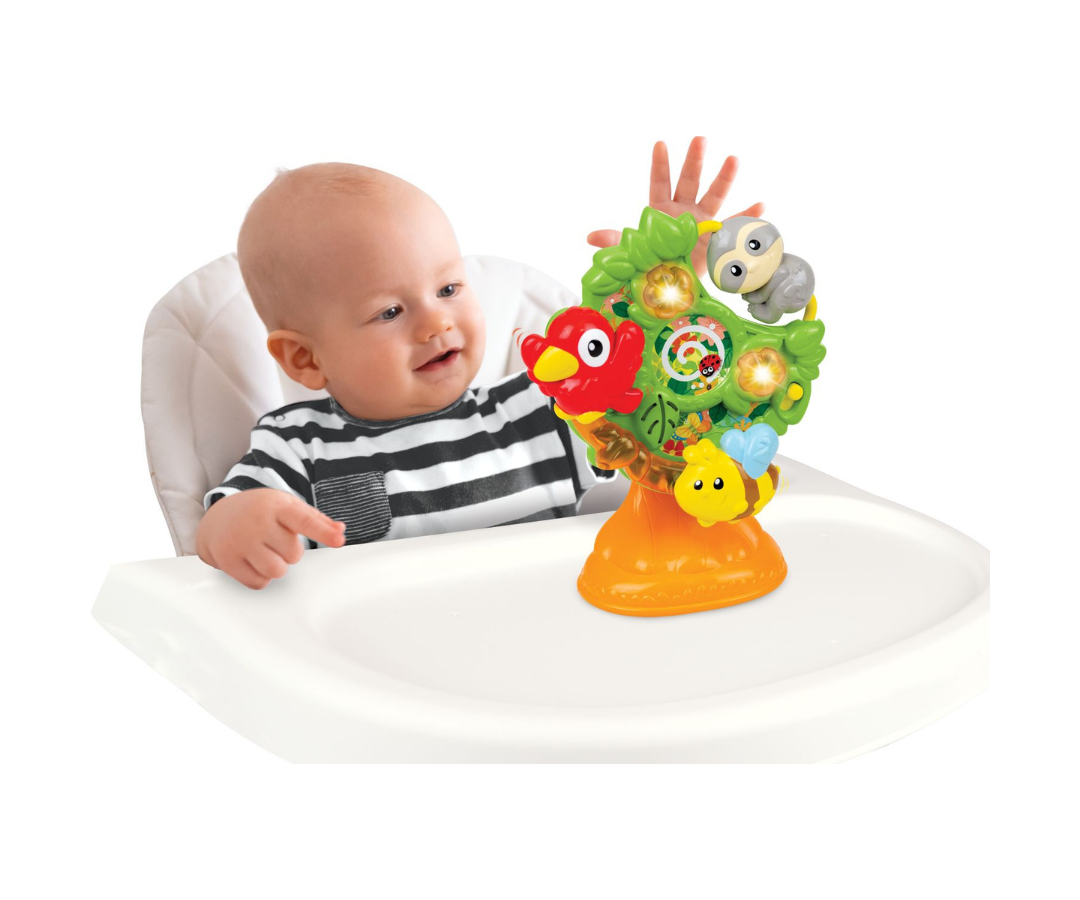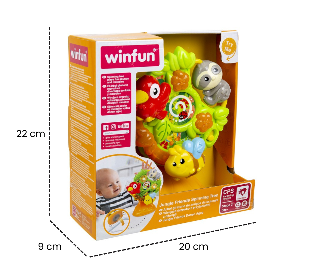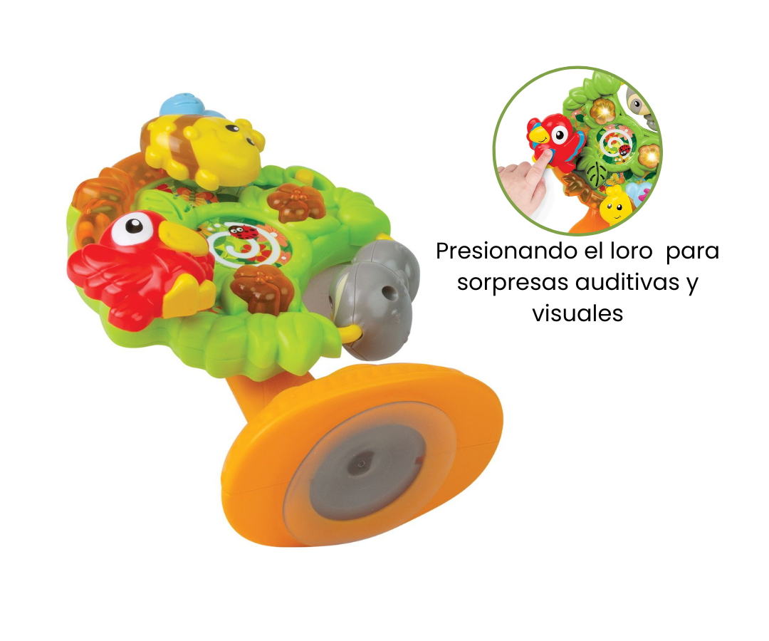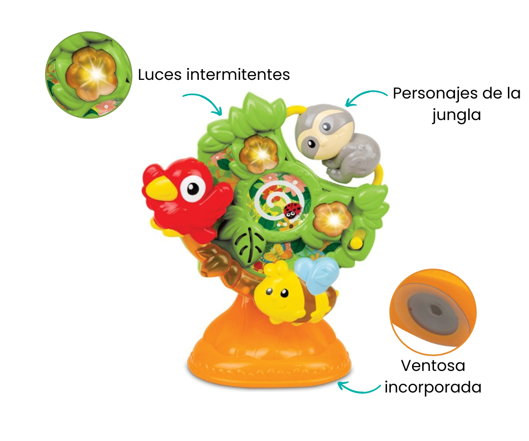 Árbol giratorio interactivo, repleto de simpáticos personajes de la jungla. Gira el árbol para desencadenar una sinfonía de sonidos divertidos, melodías encantadoras y luces intermitentes que capturarán la atención y la imaginación de tu pequeño aventurero.