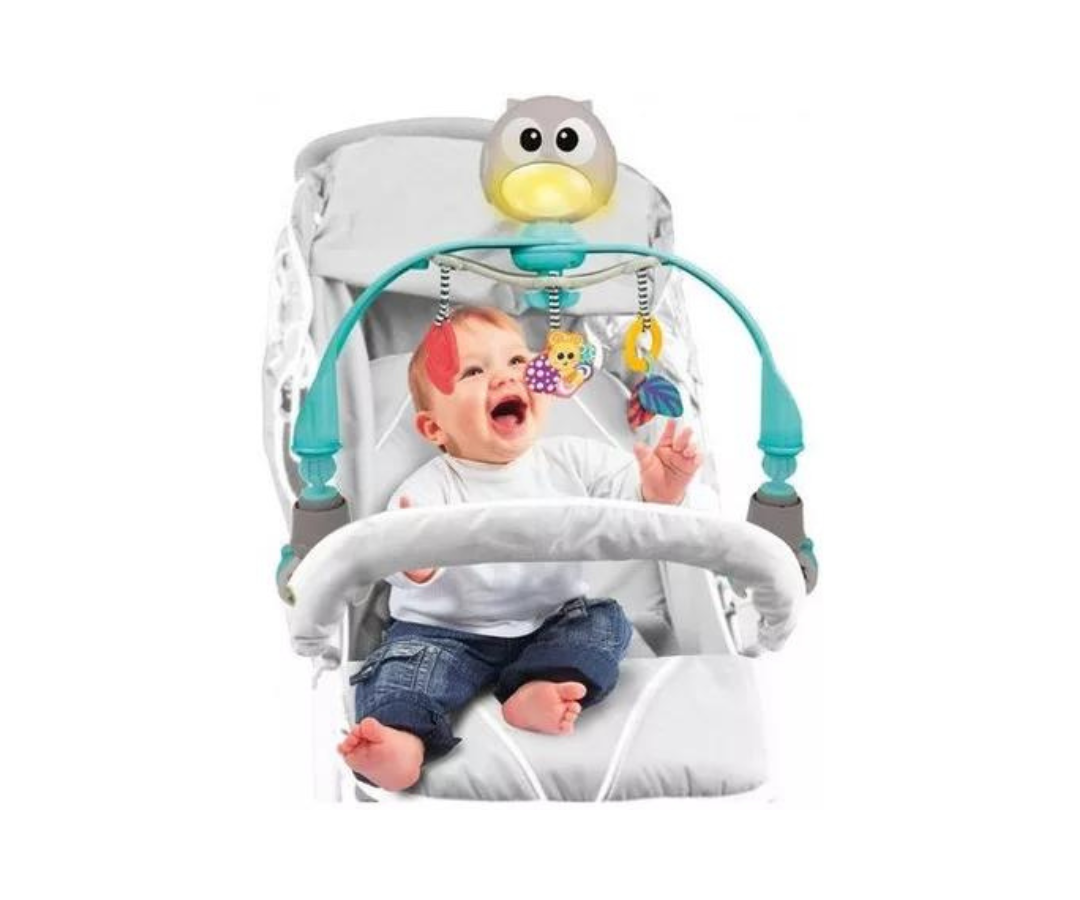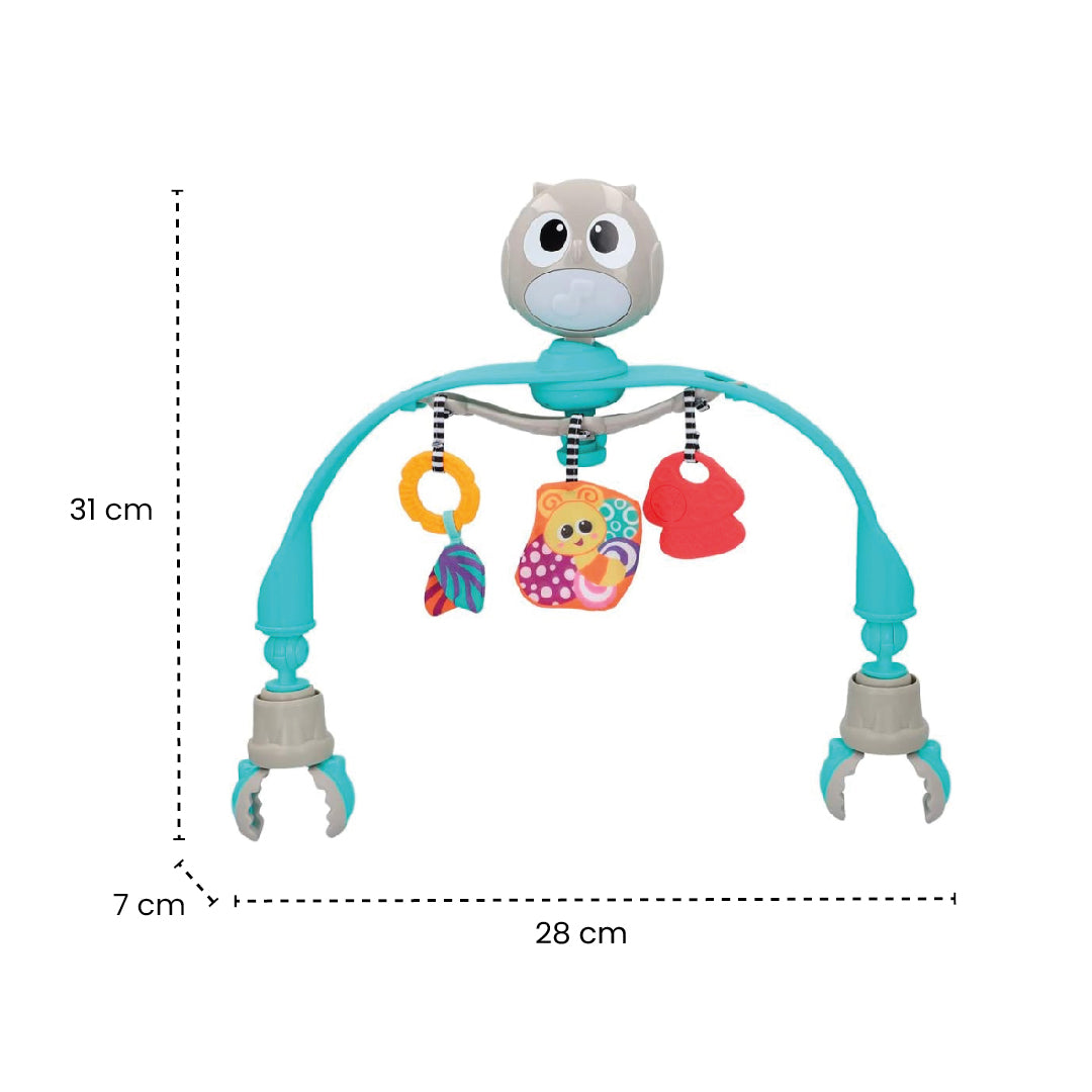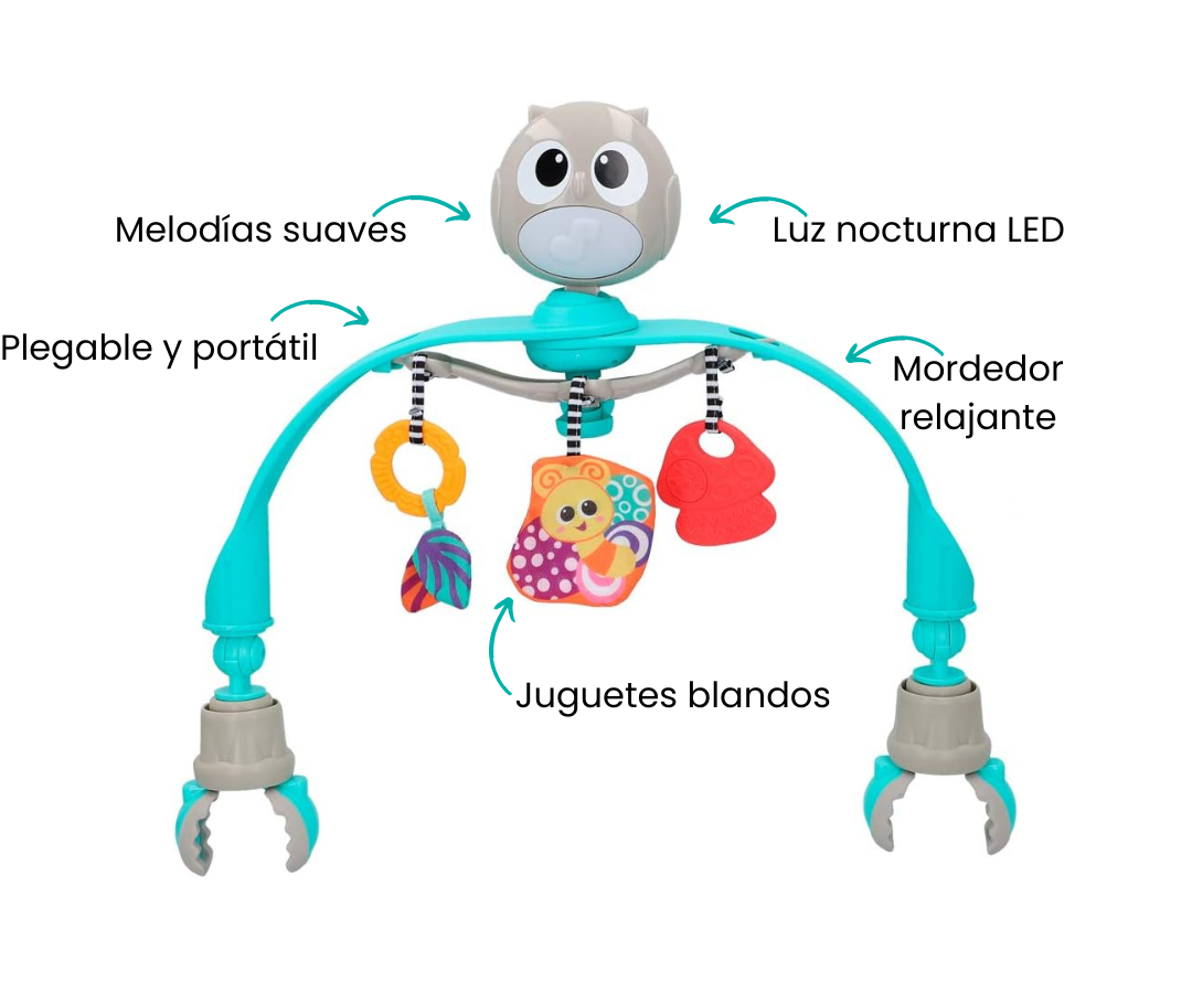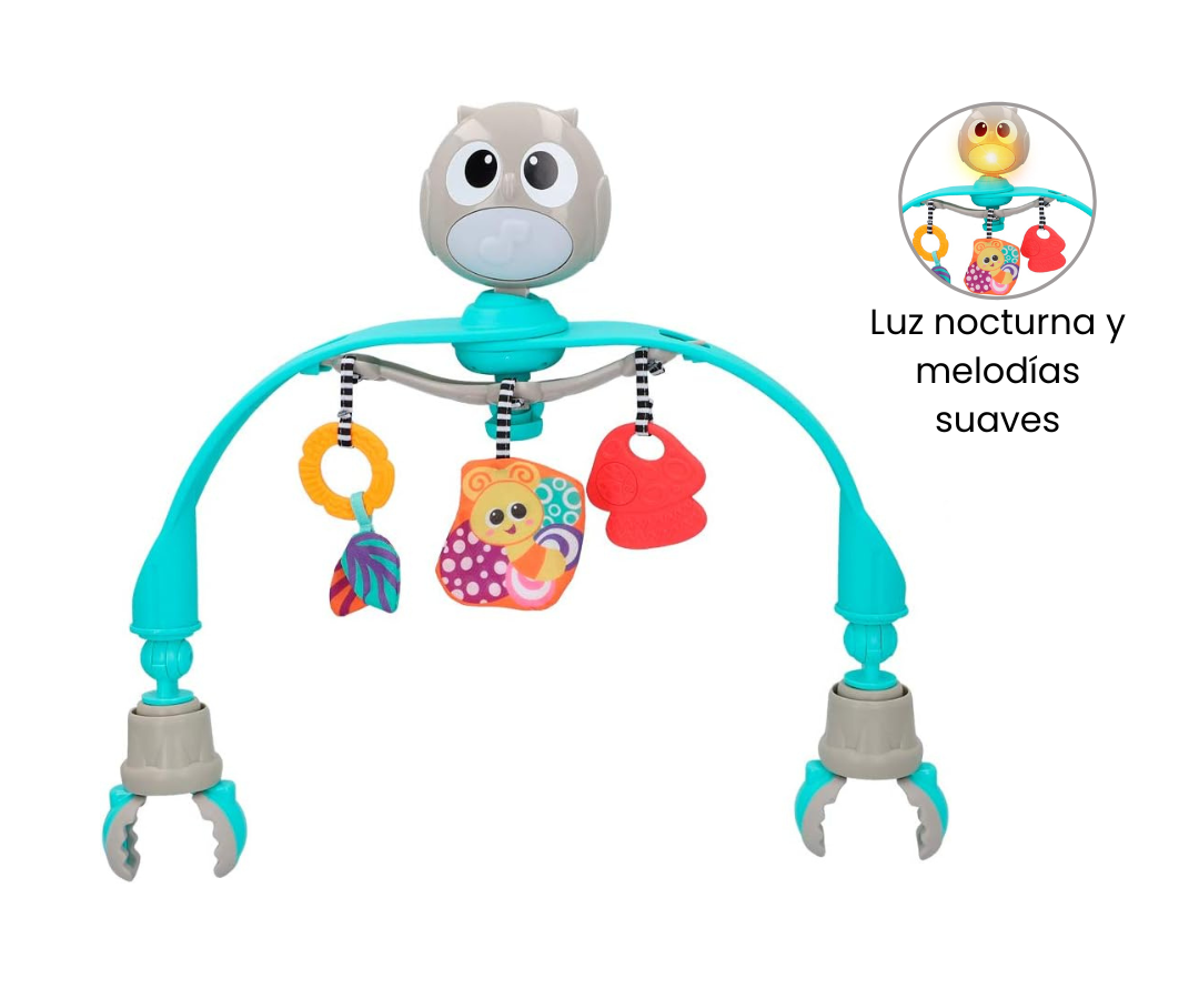 El arco de juguete cuenta con una luz nocturna LED acompañado de melodías suaves que ayudan a calmar a tu bebé. Se fija fácilmente al cochecito o al asiento del coche, brindando entretenimiento y estimulación donde sea que vayas.