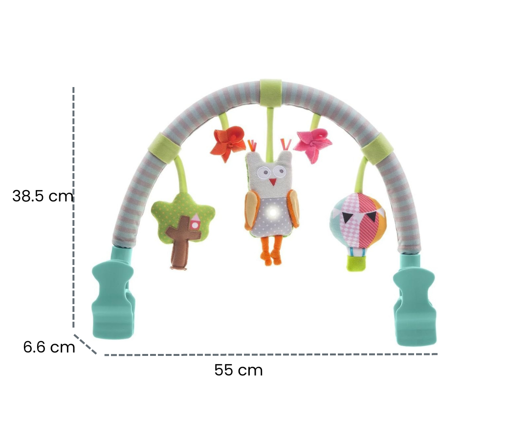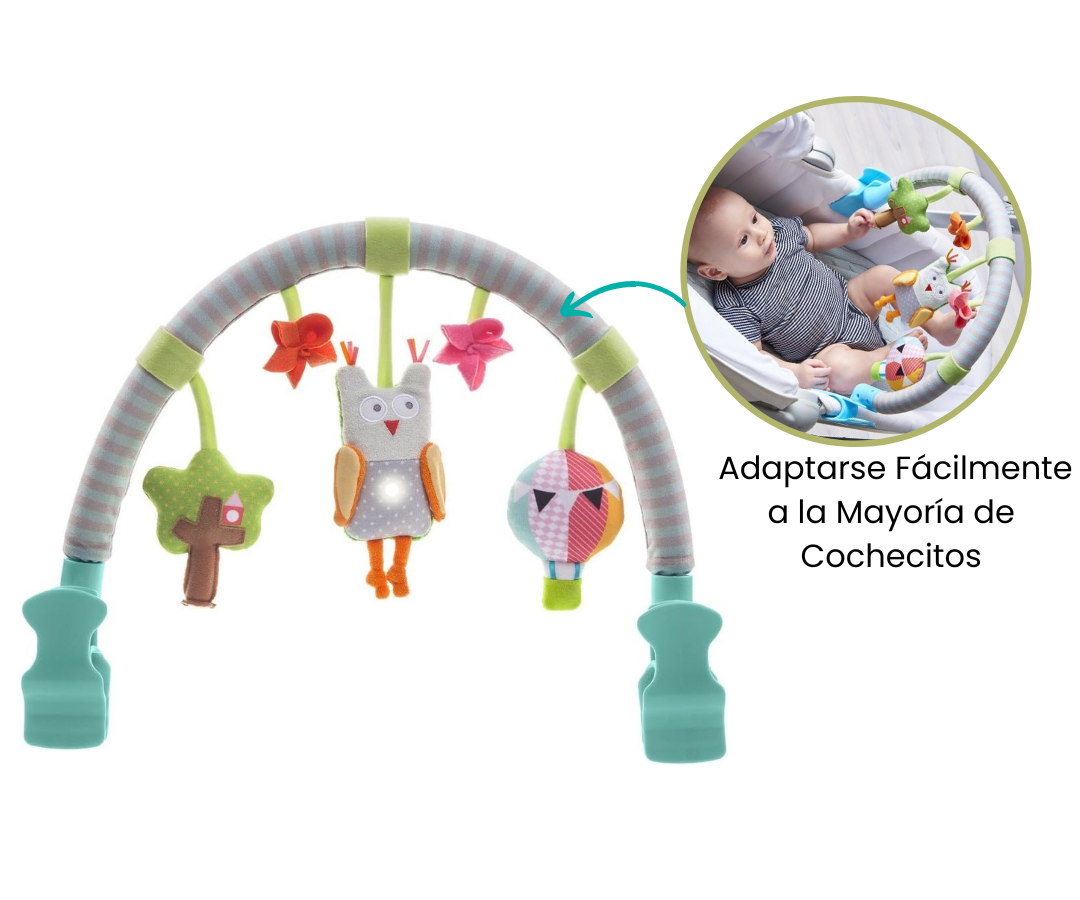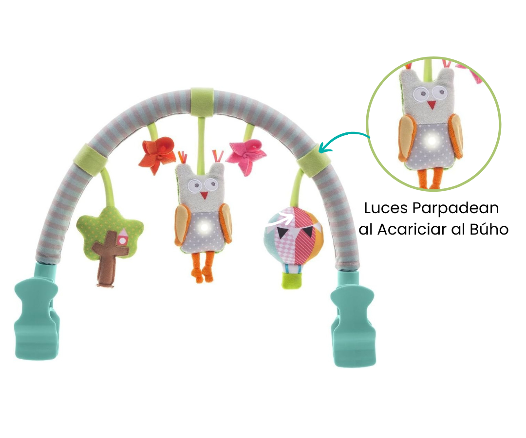 Transforma los paseos y momentos de descanso con nuestro arco de actividad, diseñado para adaptarse fácilmente a la mayoría de cochecitos, asientos de automóvil infantiles o gorilas, gracias a sus dos clips grandes y resistentes. El arco, con sus colores ricos y su textura suave, incluye un juguete musical que añade magia a la experiencia. Además, el arco viene equipado con un adorable búho musical colgante, brindando entretenimiento y estimulación para tu pequeño en cada aventura y momento de descanso