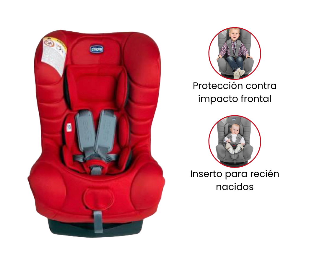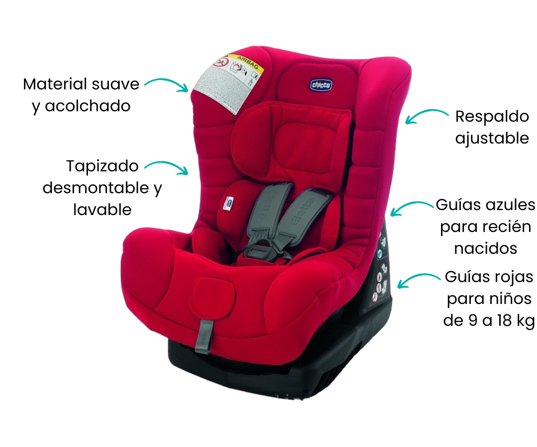Desde el nacimiento hasta los 13 kg, la silla se instala mirando hacia atrás con las guías azules y para niños que pesen entre 9 y 18 kg, el asiento debe colocarse mirando hacia delante con las guías rojas, El respaldo es ajustable y su material suave y acolchado.