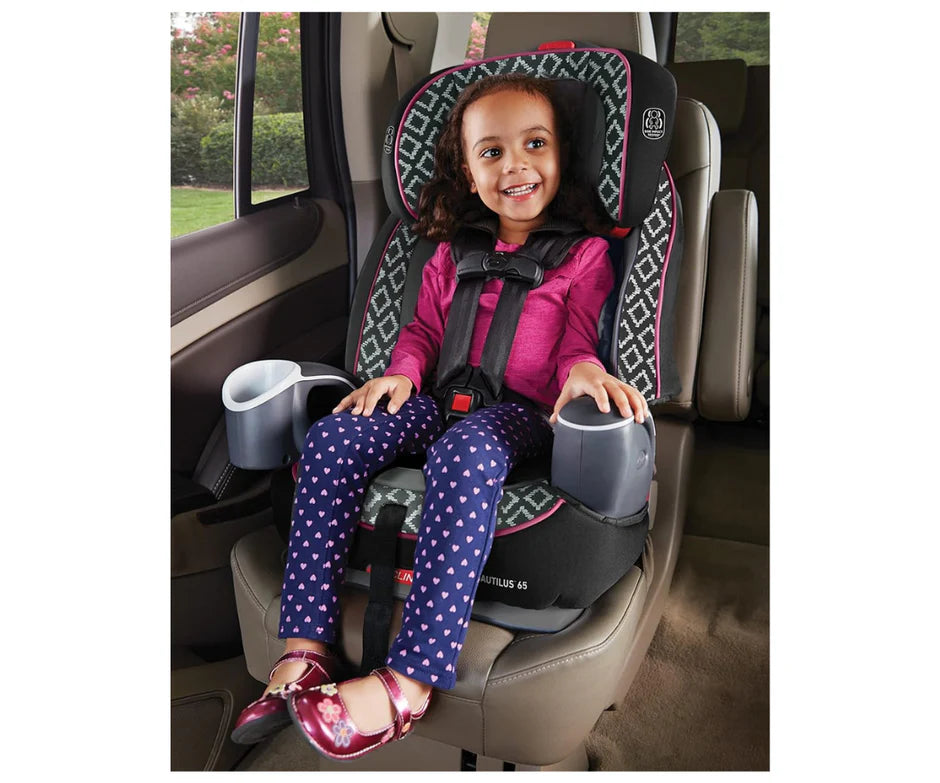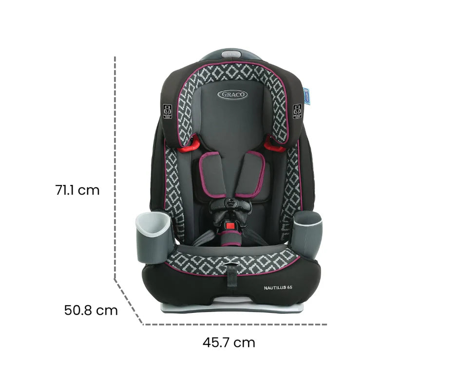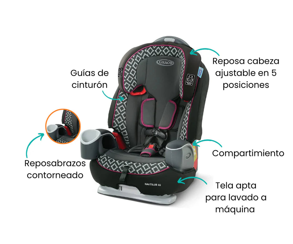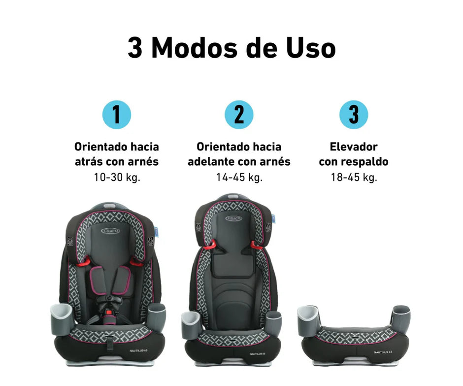El asiento de auto 3 en 1 Nautilus® 65 de Graco crece con tu hijo, ofreciendo tres modos de uso: con arnés de 5 puntos (9-29 kg), asiento elevado con respaldo (13-45 kg) y sin respaldo (18-45 kg). Su arnés Simply Safe™ ajusta arnés y reposacabezas simultáneamente, sin necesidad de re-enhebrar. Fabricado con un marco reforzado con acero, ofrece reclinación de 3 posiciones para mayor comodidad. Incluye portavasos y compartimentos de almacenamiento integrados, perfecto para acompañar a tu pequeño durante años de viajes seguros y cómodos.