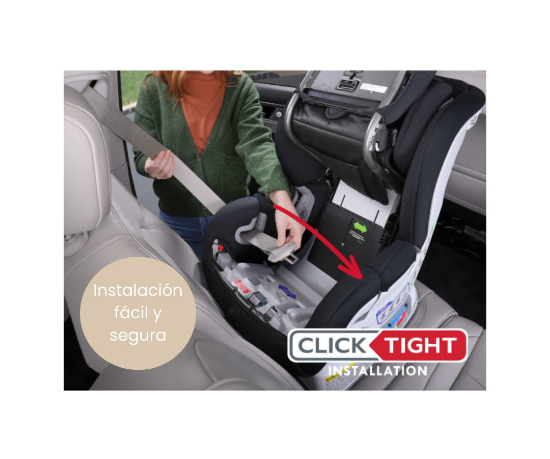 Instalación ClickTight®: ¡Sin estrés ni lucha! Las trayectorias sin obstrucciones del cinturón de seguridad despejan el camino para una instalación segura, y el tensor automático se encarga de apretarlo.