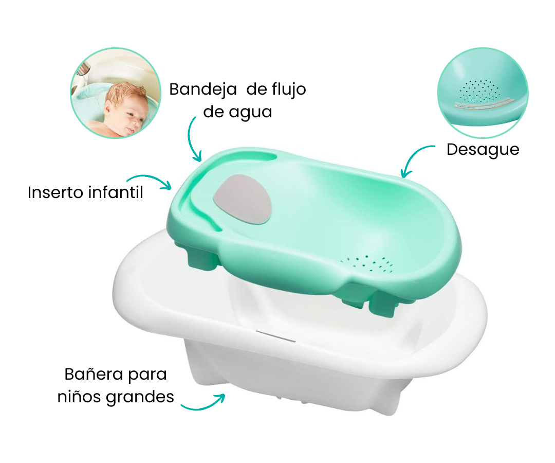 Esta bañera ofrece un entorno seguro y cómodo para la hora del baño de tu hijo. El inserto infantil presenta una bandeja especial que permite un flujo suave de agua relajante sobre el cuello y la espalda del bebé. Además, se adapta perfectamente a los recién nacidos con una inclinación suave.