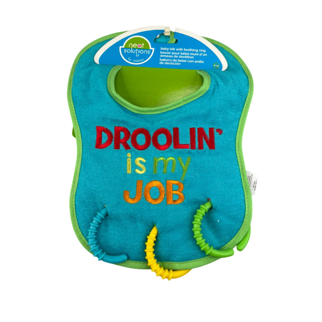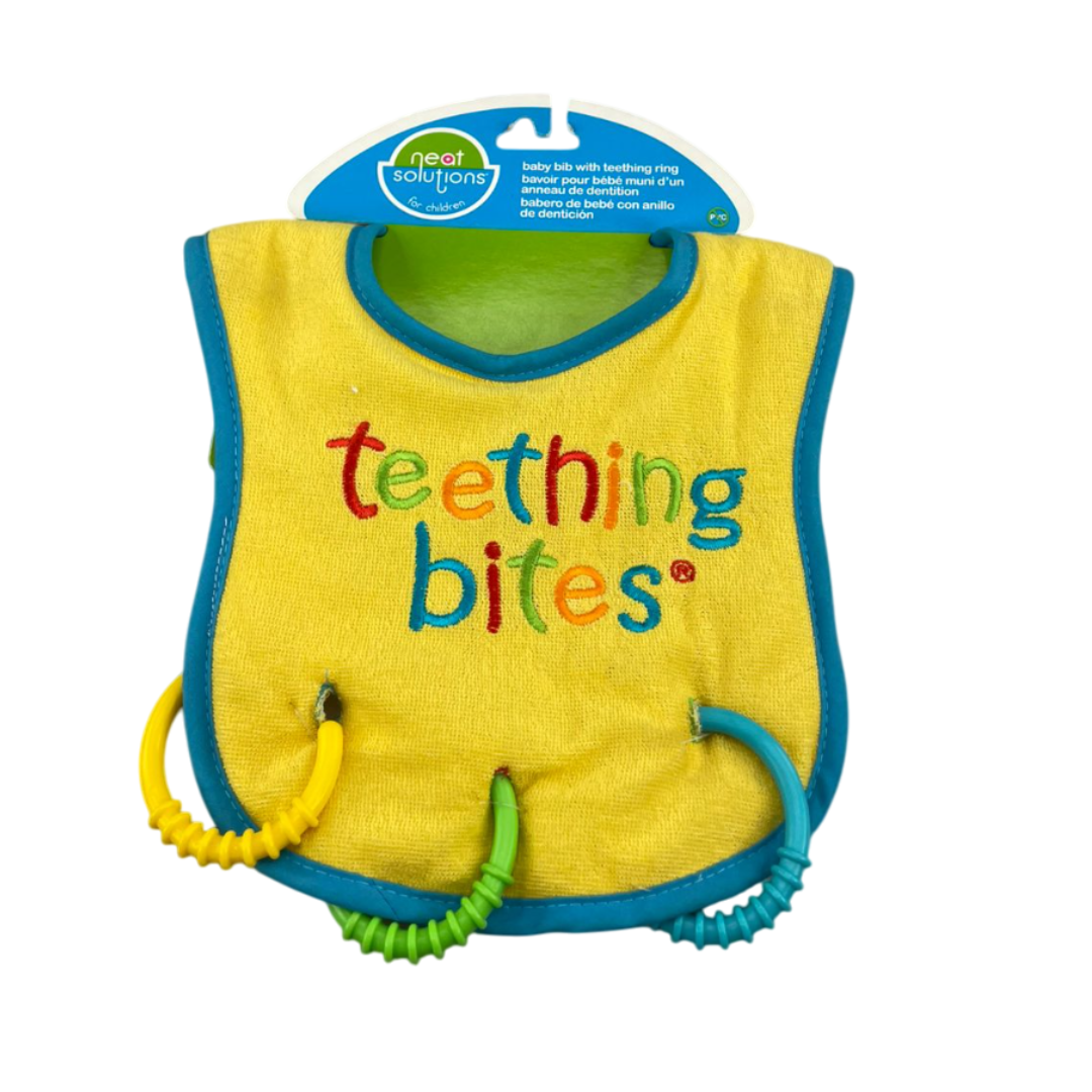 Babero con anillos de dentición. Hecho con de algodón y poliéster con dimensiones de 30 cm x 20 cm.