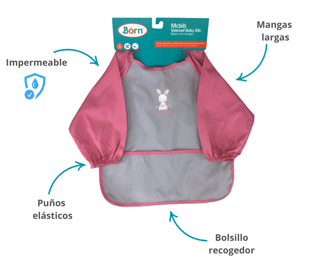 - Puños Elásticos para Mayor Sujeción: Las mangas están equipadas con puños elásticos que se ajustan suavemente a las muñecas del bebé, impidiendo que la comida o los líquidos se escurran por los brazos y brindando una barrera adicional de protección.