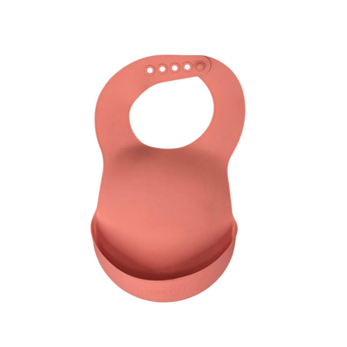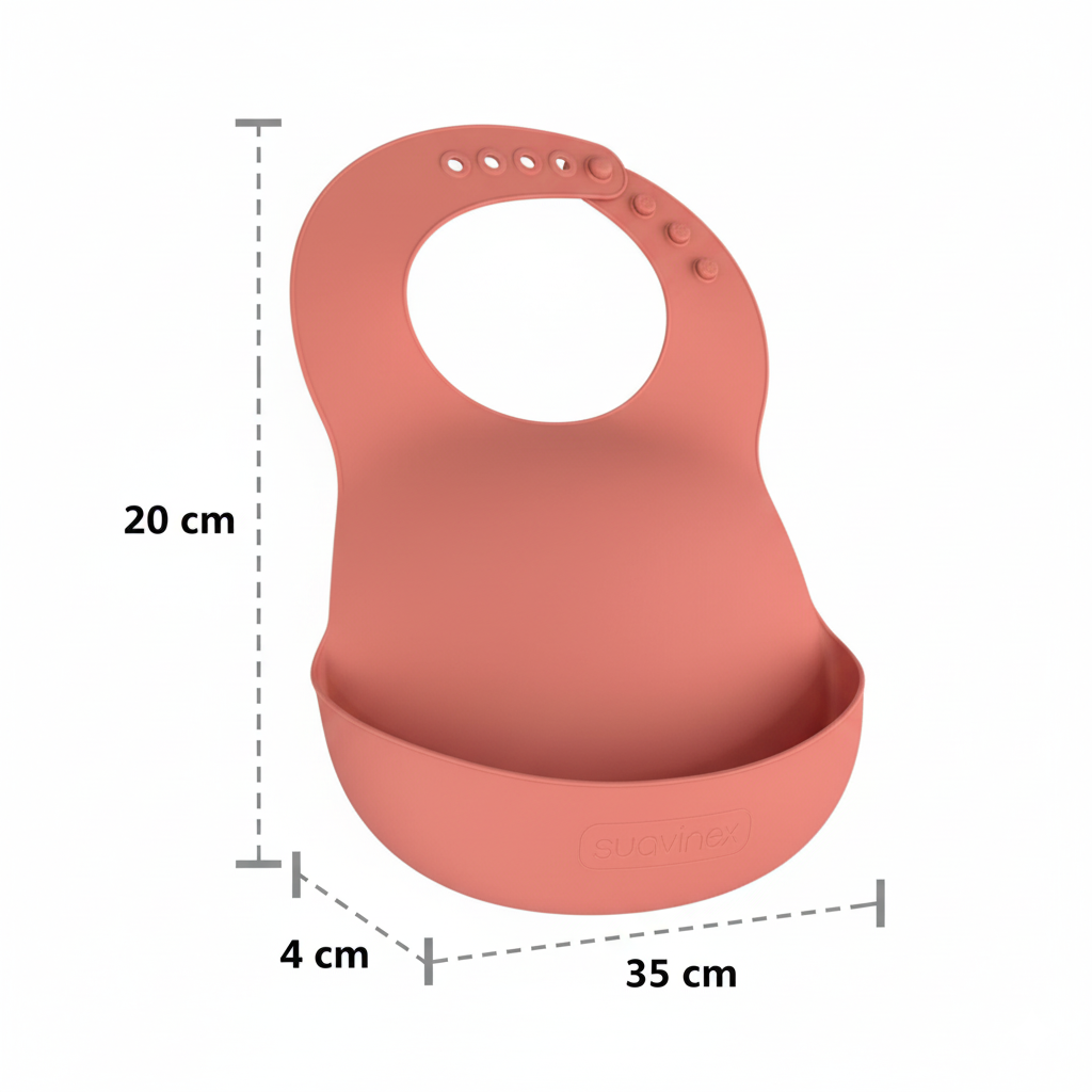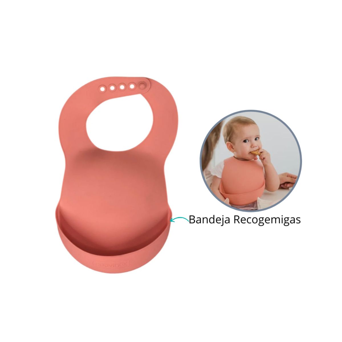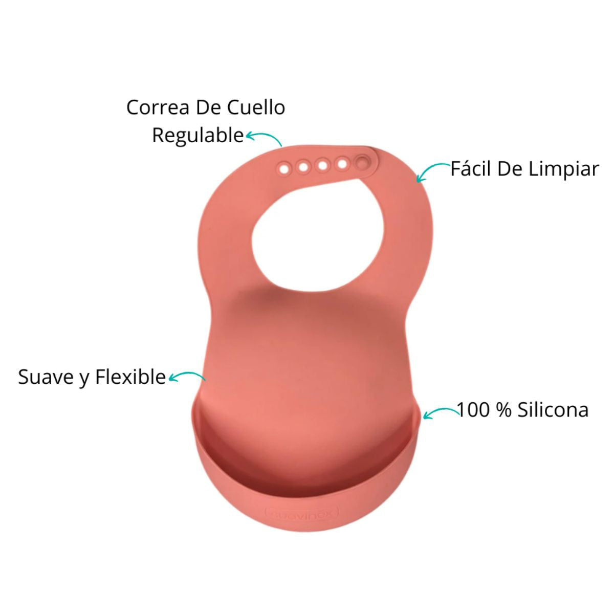 Babero de silicón, con bolsillo recoge migas y derrames, con cierre ajustable, fácil de limpiar, libre de BPA, uso adecuado desde los 4 meses.