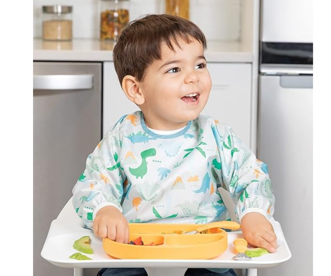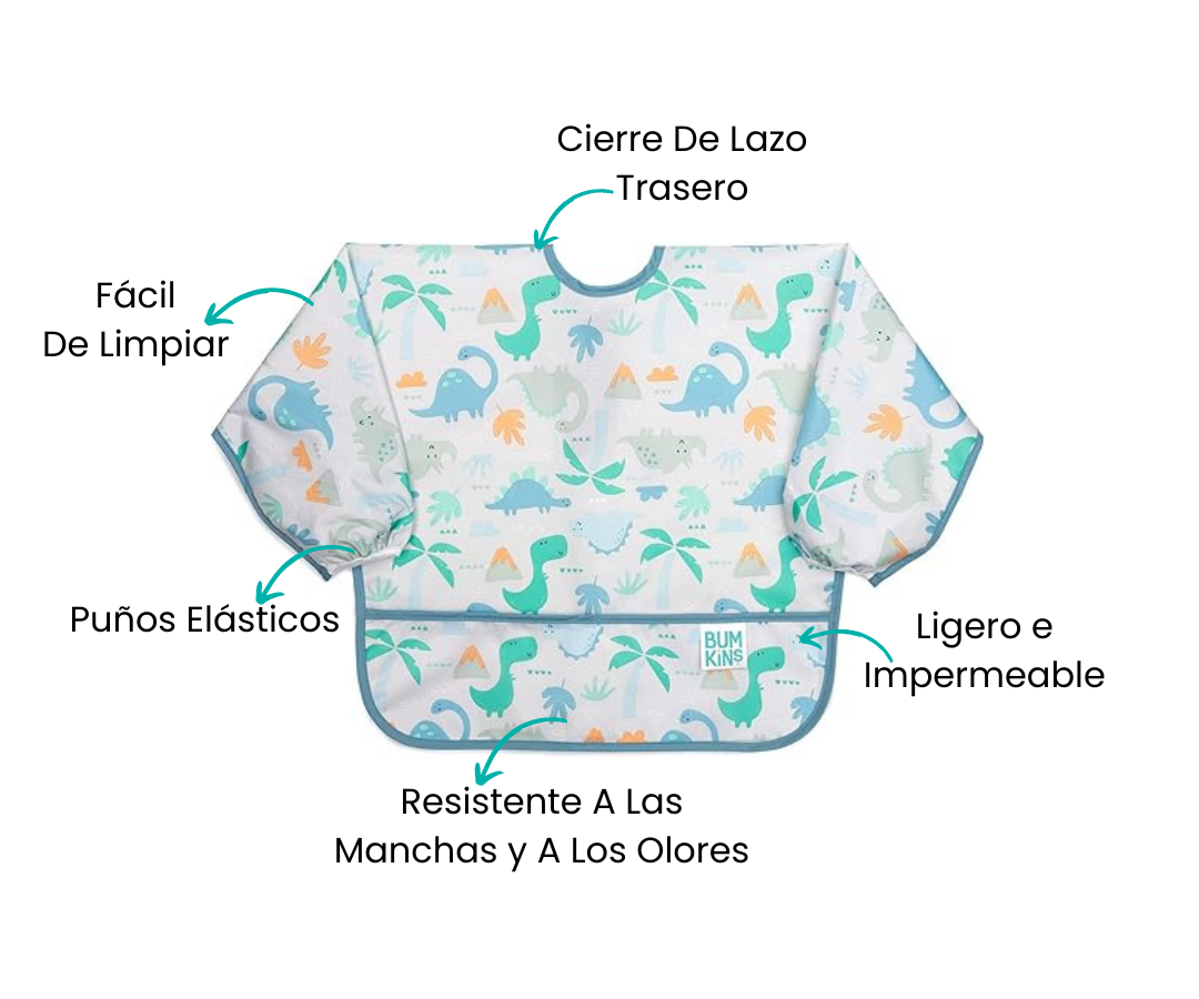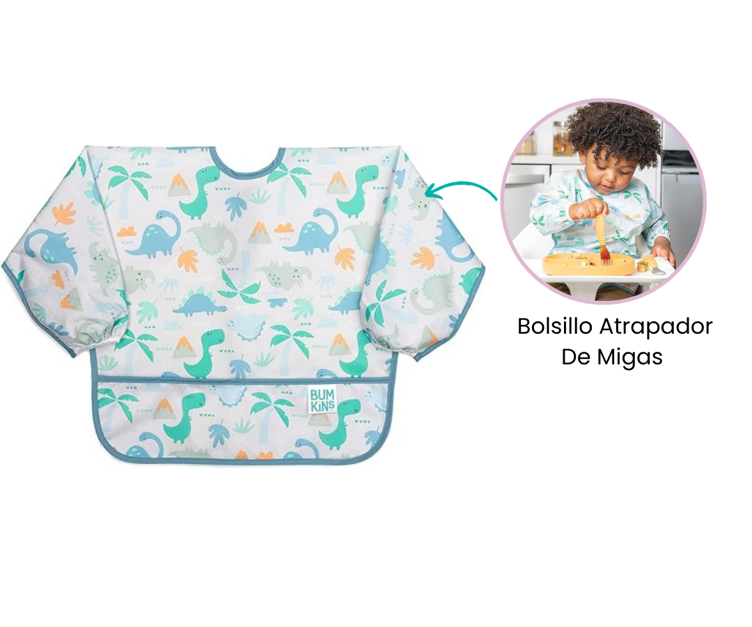 Perfecto para garantizar una hora de comida sin ensuciar, este babero cuenta con un recogedor de migas, así como mangas largas para proteger la ropa de tu pequeño de escupitajos, manchas o accidentes. Es esencial cuando tu hijo está comenzando con sólidos, brindando una solución práctica para mantenerlo limpio y cómodo durante las comidas. Con un diseño funcional y fácil de limpiar, este babero se convierte en un aliado indispensable para los padres ocupados.