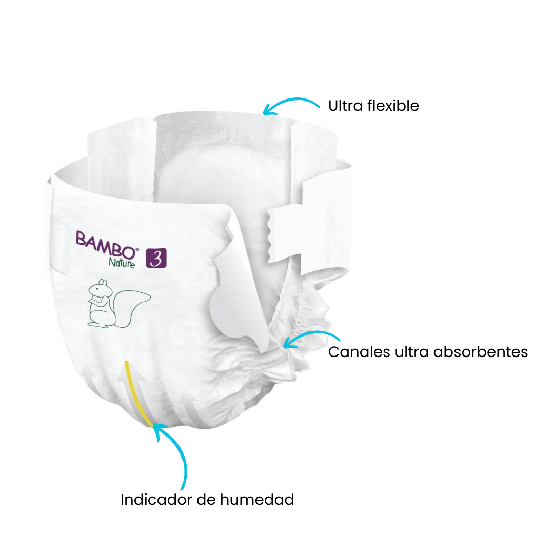 Bambo es una elección consciente para padres preocupados por el bienestar de sus bebés y el medio ambiente. Cuenta con un práctico indicador de humedad y está libre de perfumes y parabenos para minimizar el riesgo de alergias.