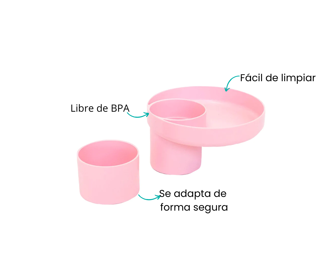 Presentamos la innovadora bandeja de Vaso Universal para Niños. Esta bandeja extiende su portavasos actual para sostener su taza ademas de una bandeja para guardar alimentos o juguetes. Se adapta a asientos de automóvil, cochecitos, sillas de exterior.