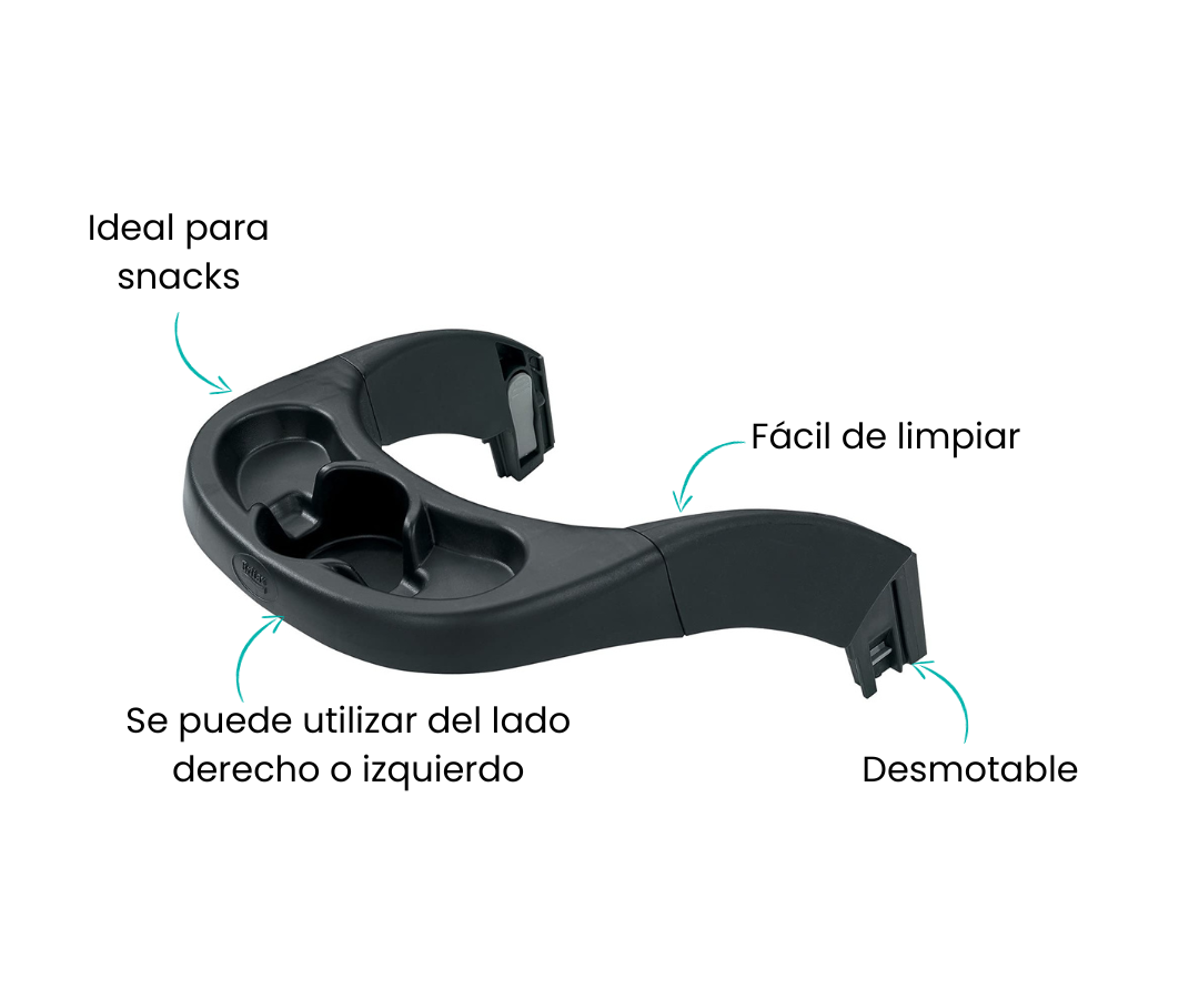 • La bandeja para niños cuenta con un portavasos y una superficie plana para alimentos, vasitos para sorber, juguetes y más.