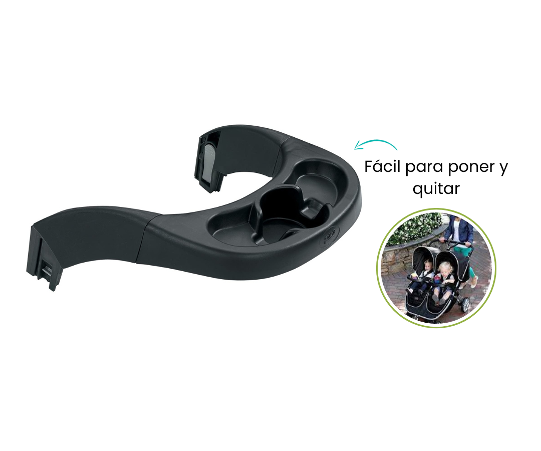 La versatilidad está a tu alcance: simplemente suelta cada lado de la bandeja de forma individual para facilitar la carga y descarga. Además, se fija de manera segura al armazón del cochecito individual con la facilidad de un solo botón, brindándote comodidad y practicidad mientras te aventuras en tus paseos.