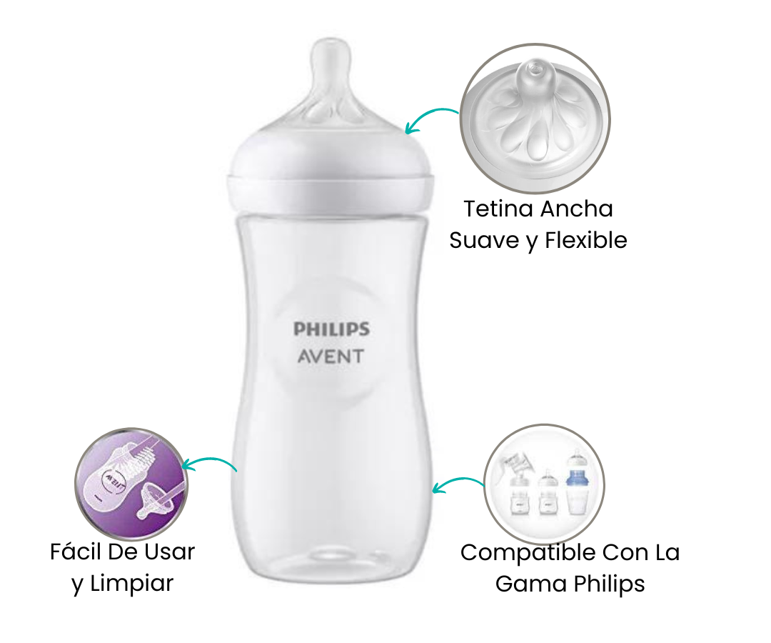 El biberón Philips Avent Natural Response, libera leche solo cuando el bebé lo activa. Los bebés pueden beber, tragar y respirar siguiendo su ritmo natural como en el pecho. Facilita la combinación de lactancia materna y biberón, gracias a la tetina ancha en forma con un tacto suave que imita la forma y el tacto de un pecho.