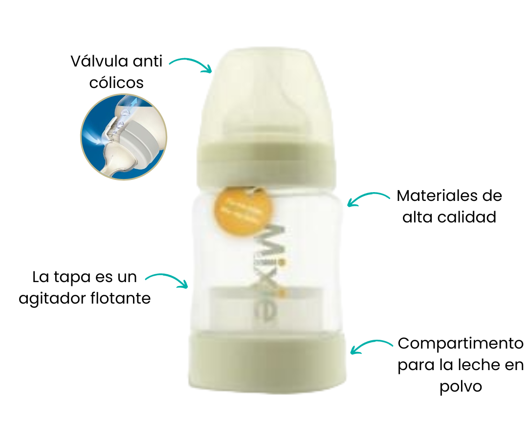 Sistema inteligente que mantiene la fórmula separada del líquido dentro del biberón. Cuando estés listo, presionas la parte inferior, agitas y la tapa del compartimento actúa como un agitador flotante, asegurando una mezcla efectiva y eliminando los grumos de polvo.