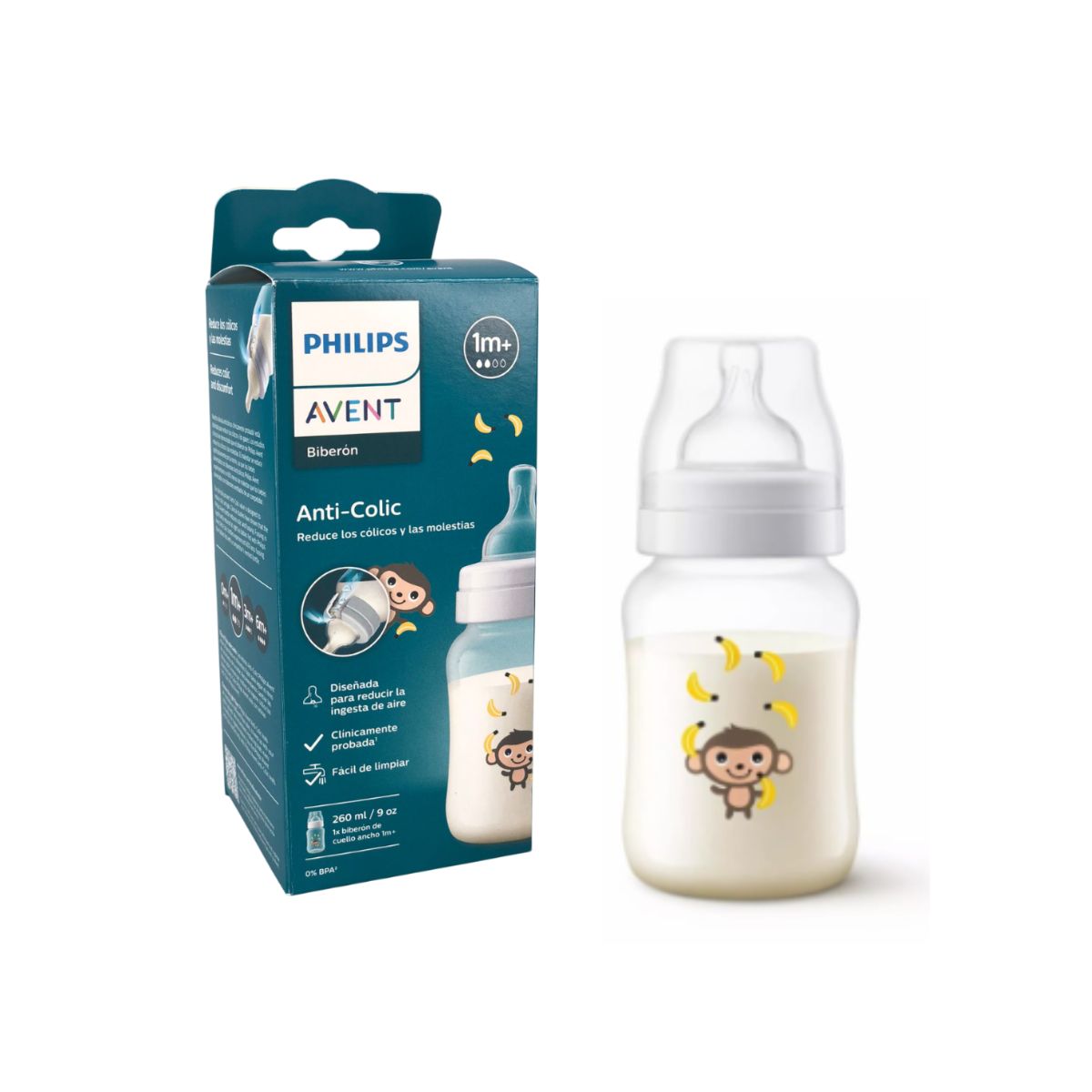 Biberón Avent decorado con diseño de animalitos, 9oz, diseñado para reducir la ingesta de aire, tetina incluida de 1 mes a +.