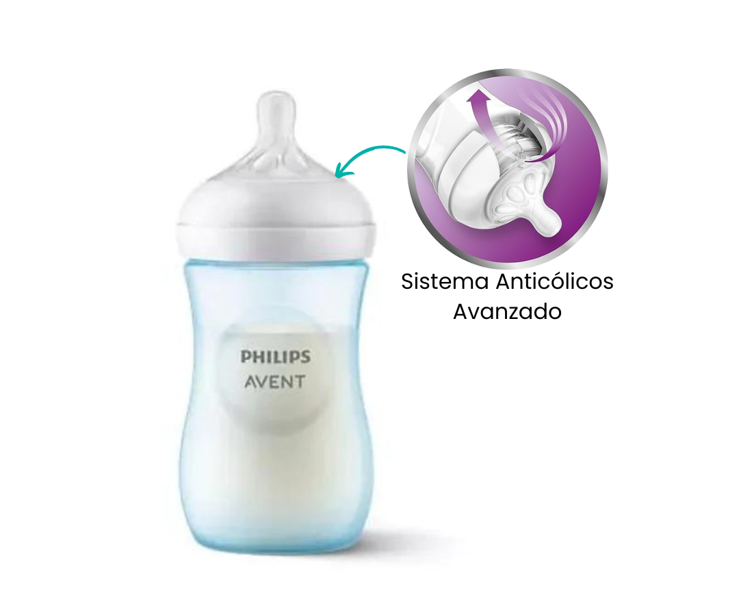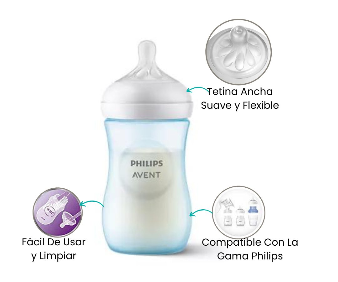 El biberón Philips Avent Natural Response, libera leche solo cuando el bebé lo activa. Los bebés pueden beber, tragar y respirar siguiendo su ritmo natural como en el pecho. Facilita la combinación de lactancia materna y biberón, gracias a la tetina ancha en forma con un tacto suave que imita la forma y el tacto de un pecho.