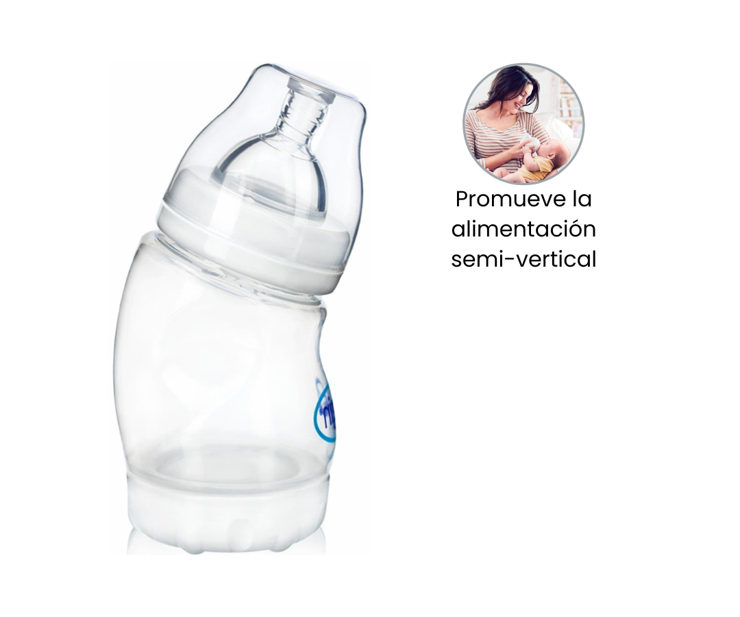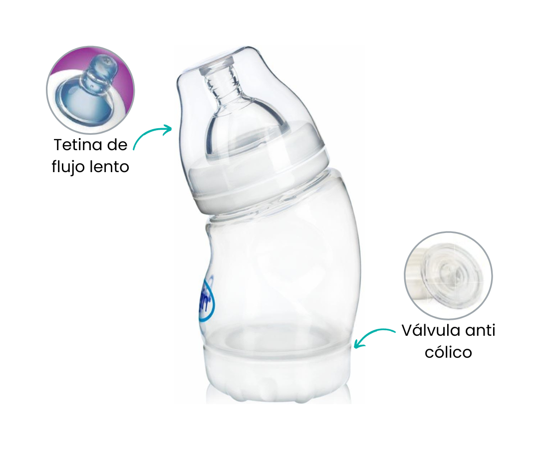 Biberón fabricado en polipropileno y libre de Bisfenol. Es más que una simple botella, incluye una tetina de flujo lento para una alimentación adecuada. Su diseño contribuye a prevenir las infecciones del oído del bebé, brindando tranquilidad y cuidado en cada alimentación.