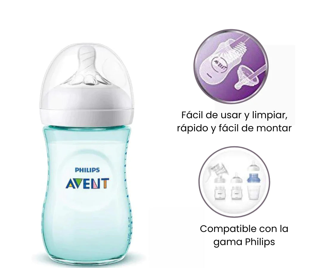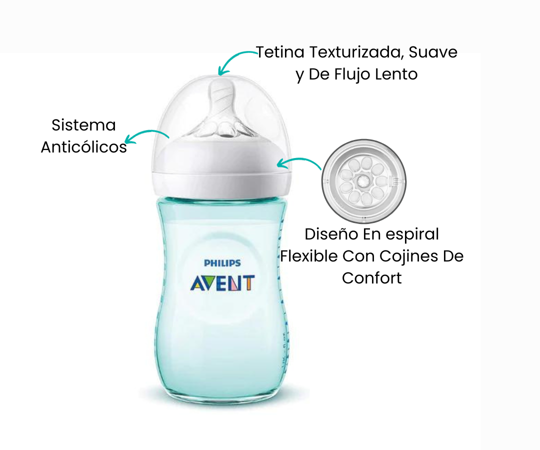 El biberón natural 260 ml AVENT cuenta con tetina ultra suave que se asemeja más al pecho, cuenta con diseño anti cólicos para evitar las filtraciones durante la alimentación pensando en que puedan disfrutar de una experiencia realmente agradable y mantener el aire lejos de la barriguita de tu bebé.