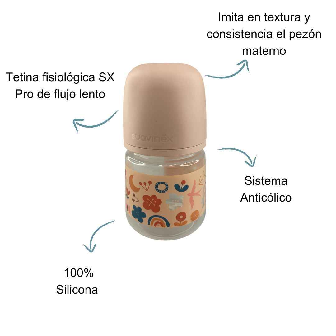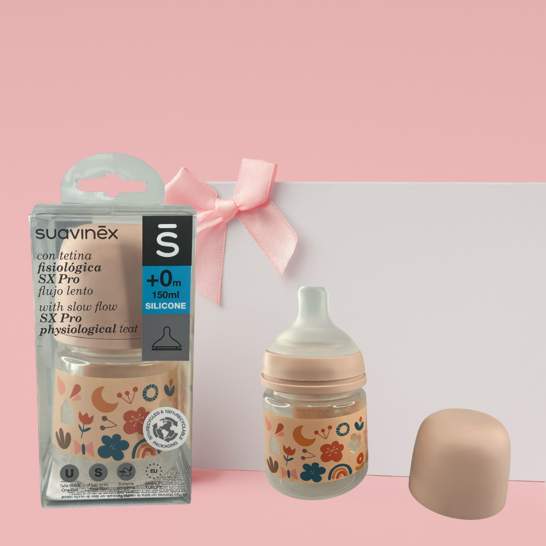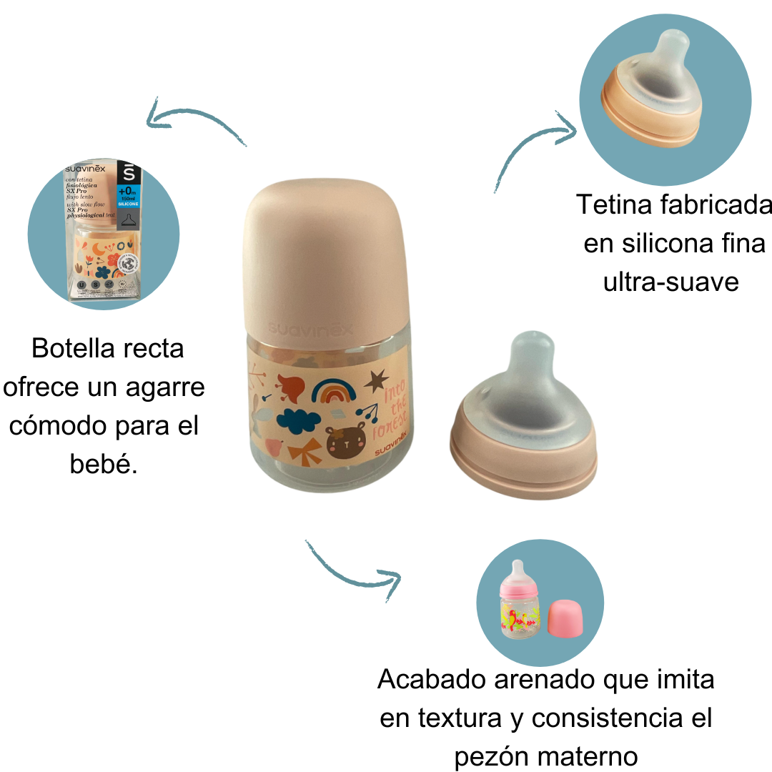 Nuevo biberón con tetina fisiológica SX Pro de flujo lento. Biberón 150ml para bebés +0 meses, desde el nacimiento. Diseñada para respetar el desarrollo de la cavidad oral del bebé.
