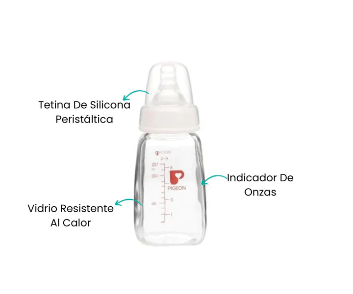 Ofrece a tu bebé la mejor experiencia de alimentación con el Biberón de Vidrio Pigeon de 4 onzas. Equipado con un sistema anticolico y la tetina peristáltica de boca estándar, cada comida se convierte en un momento de conexión y bienestar. Tu pequeño disfrutará de una alimentación suave y natural, mientras tú te sientes seguro y confiado en la elección de Pigeon.