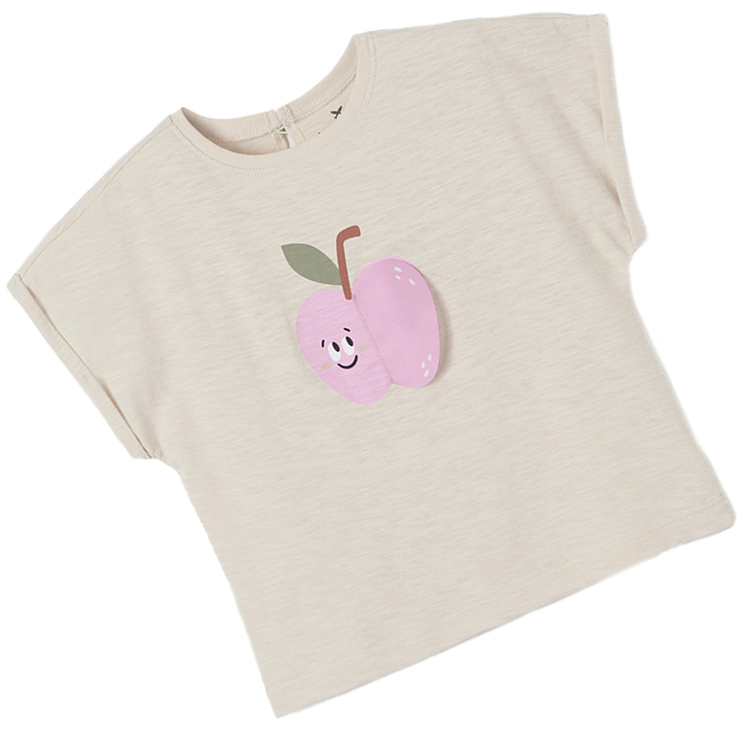 Blusa de niña de manga corta, corte cómodo y holgada al cuerpo. Tiene escote redondo y estampado localizado. Desarrollado en punto medio 100% algodón.