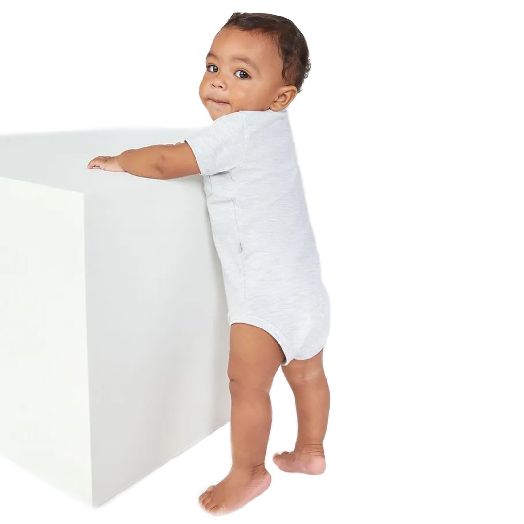 El body de cuello alto para niño está confeccionado en punto de piqué de algodón. Tiene una abertura con botones de presión en la entrepierna, un pechera funcional, un cubrecuello y lo más destacado es el pequeño bolsillo con bordado de peces superpuestos, que le da a la prenda un encanto especial.