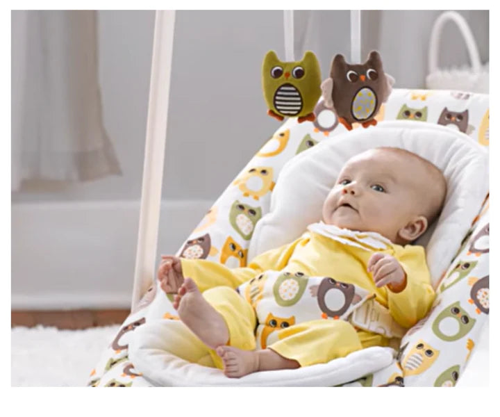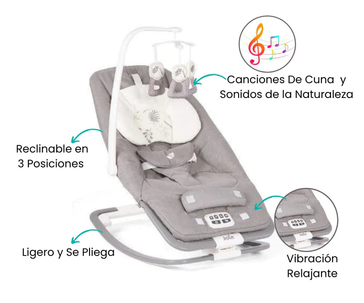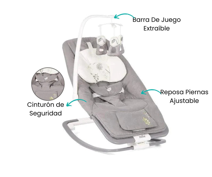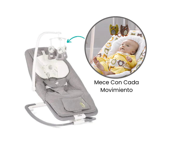 El bouncer incluye un arco de juguetes desmontable que cuelga sobre el asiento, ofreciendo entretenimiento interactivo para tu bebé. Estos juguetes colgantes no solo estimulan sus sentidos, sino que también fomentan la coordinación mano-ojo mientras intentan alcanzar y agarrar los objetos. Una manera divertida y educativa de mantener a tu pequeño comprometido y desarrollando habilidades motoras desde una edad temprana.