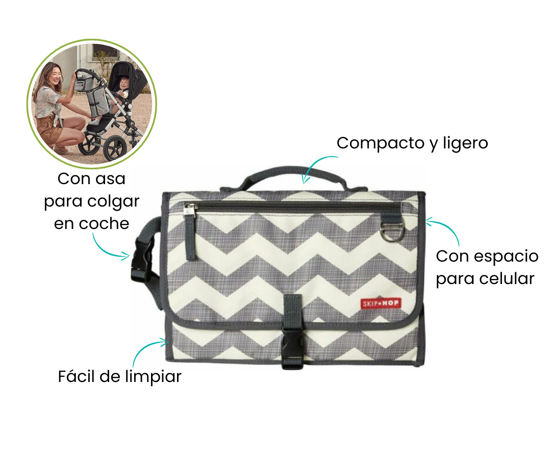 El bolsillo grande de malla tiene capacidad para hasta cuatro pañales más cremas y otros elementos esenciales, mientras que el bolsillo frontal con cremallera es perfecto para llaves, teléfono celular u otros artículos personales.