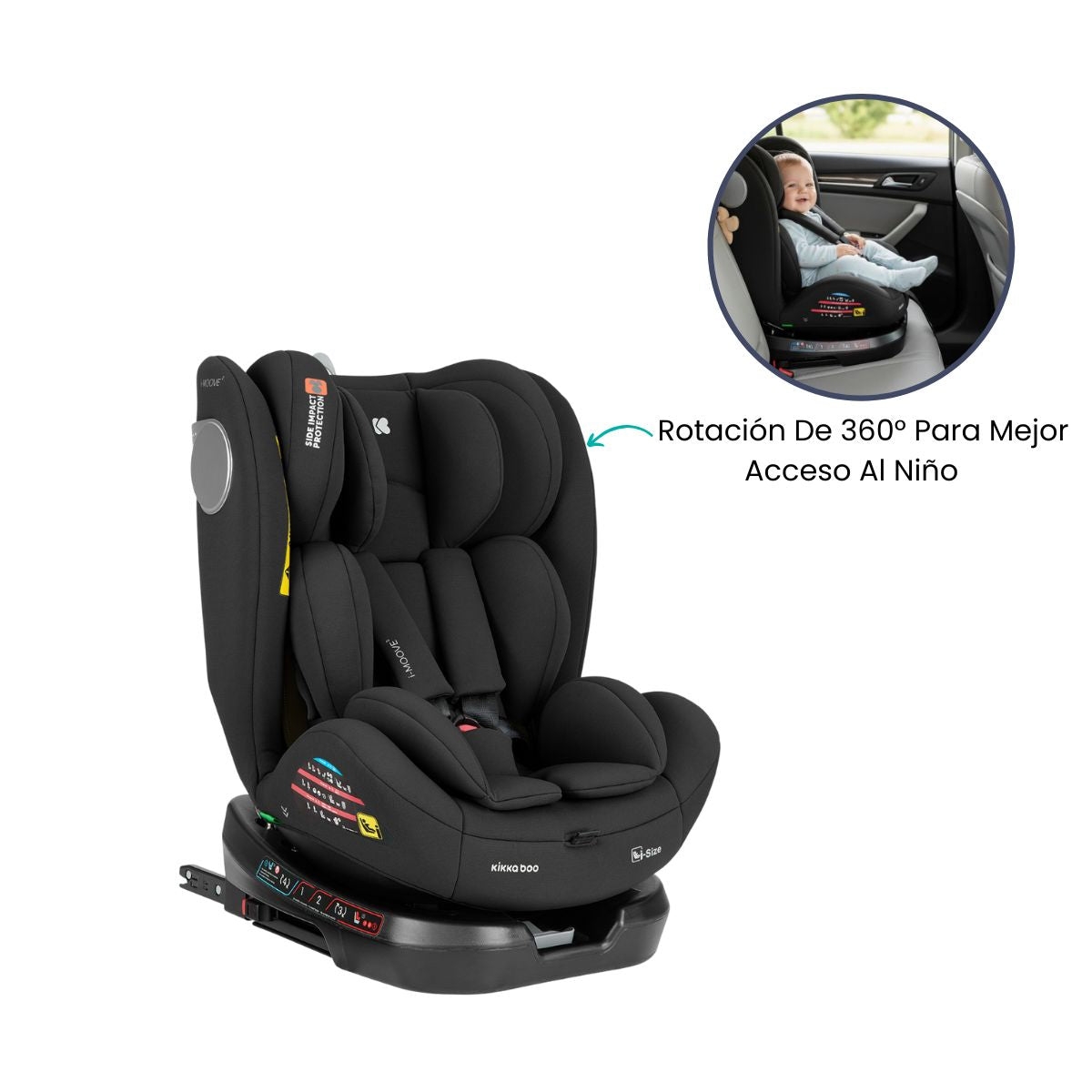 Está diseñado para utilizarse desde bebés de 40 cm de altura hasta niños de hasta 150 cm (aproximadamente hasta los 12 años), cambiando entre orientación mirando hacia atrás y hacia adelante conforme crecen. Incluye rotación de 360° para facilitar colocar al pequeño en el asiento sin doblar la espalda, arnés de cinco puntos con ajustes simultáneos, ISOFIX y top tether para fijación estable, y varios niveles de reclinación para ajustar la postura dependiendo del modo (trasero o frontal).