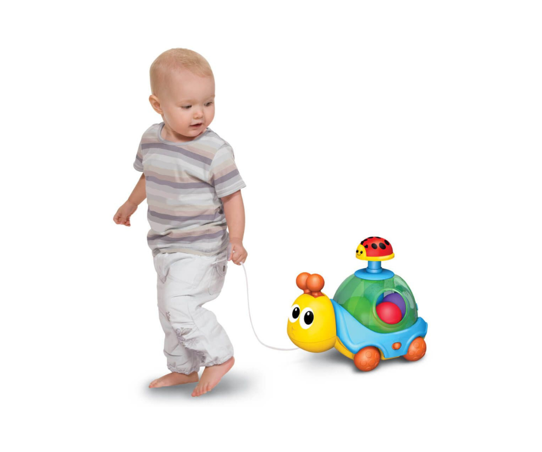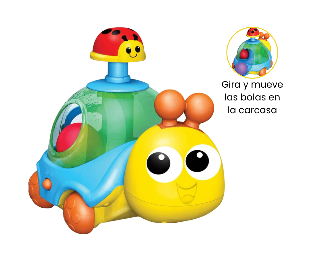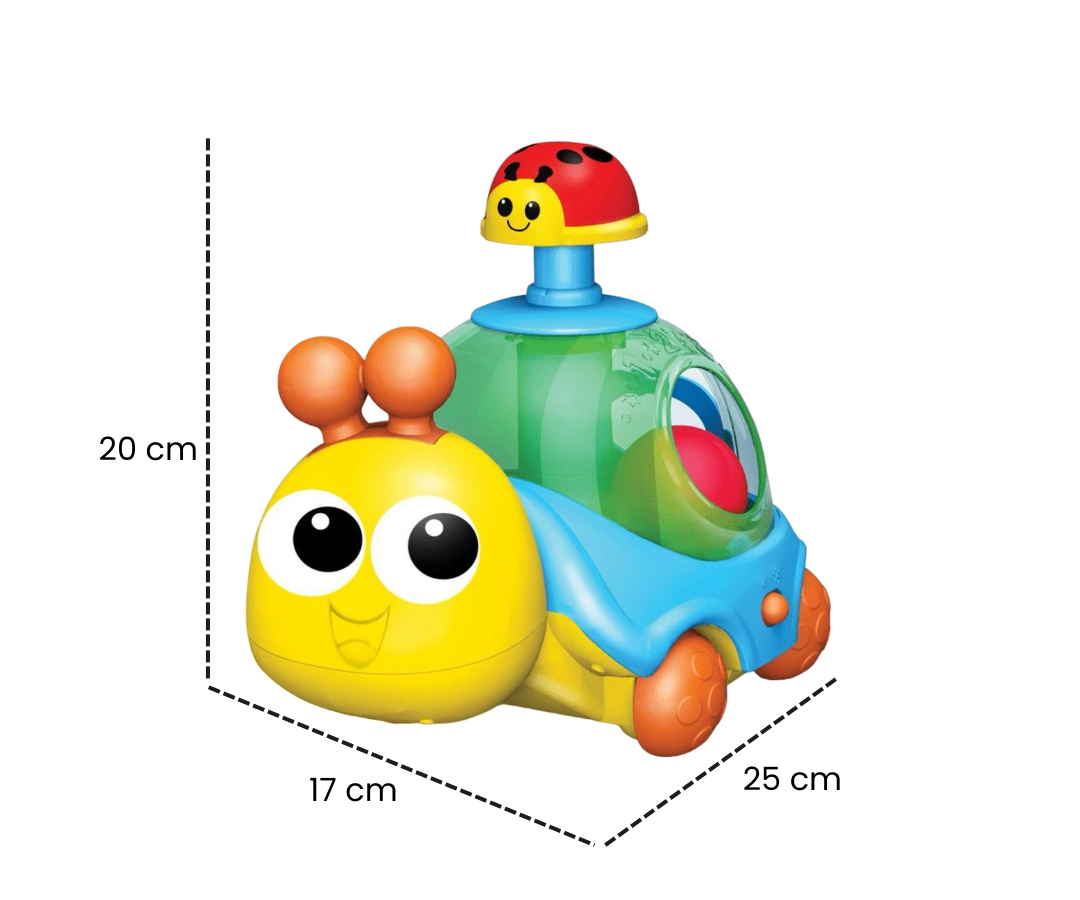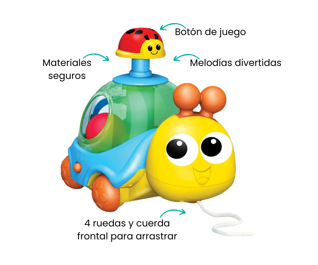 Caracol de arrastre con juego de bolas y melodías, adecuado para acompañar a tu bebe en sus primeros pasos. El caracol tiene cuatro ruedas y una cuerda en la parte delantera para que el pequeño lo arrastre cómodamente mientras pasea.