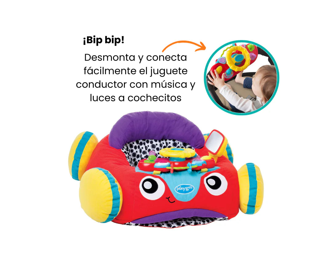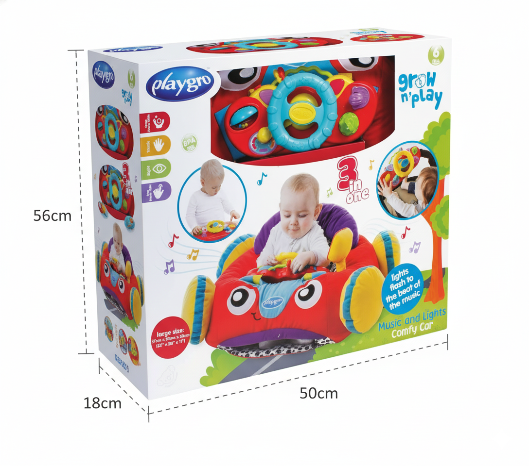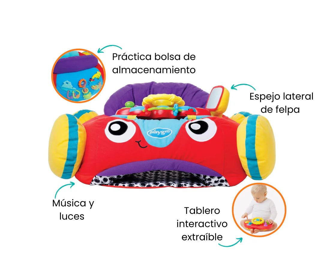 Siéntate y juega en el Coche Cómodo con Luces y Música de Playgro. Este auto de peluche repleto de funciones musicales fomenta el desarrollo de habilidades motoras y el juego imaginativo. Al bebé le encantará el sonido de la bocina, el clic del indicador y las bolas que suenan girando, este adorable cochecito para bebé también viene con un espejo lateral para ayudar al bebé a aprender sobre los reflejos.