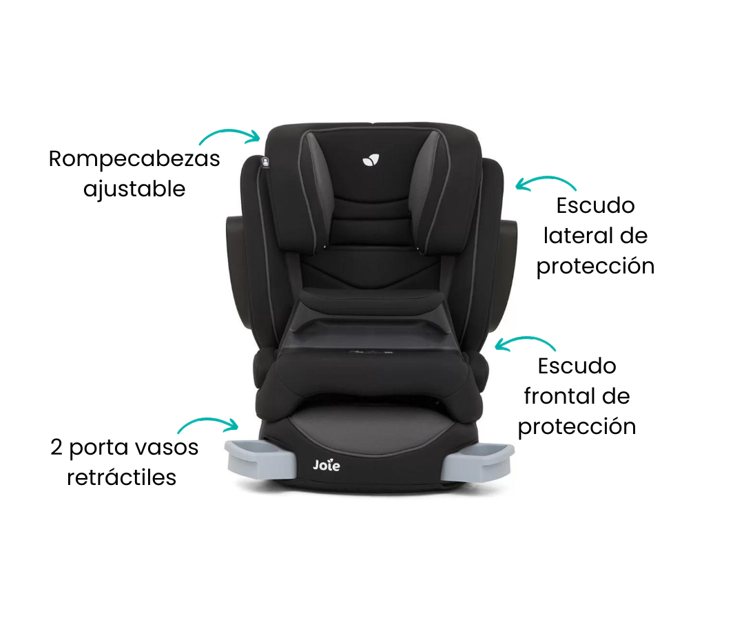 Este asiento esta diseñado para niños de 1 a 12 años y se caracteriza por tener un sistema de escudo frontal, que absorbe la energía del impacto y la distribuye de manera uniforme para reducir el riesgo de lesiones en el cuello y el pecho de tu hijo. Además está equipado con protección contra impactos laterales, lo que brinda una seguridad adicional en caso de colisión lateral.