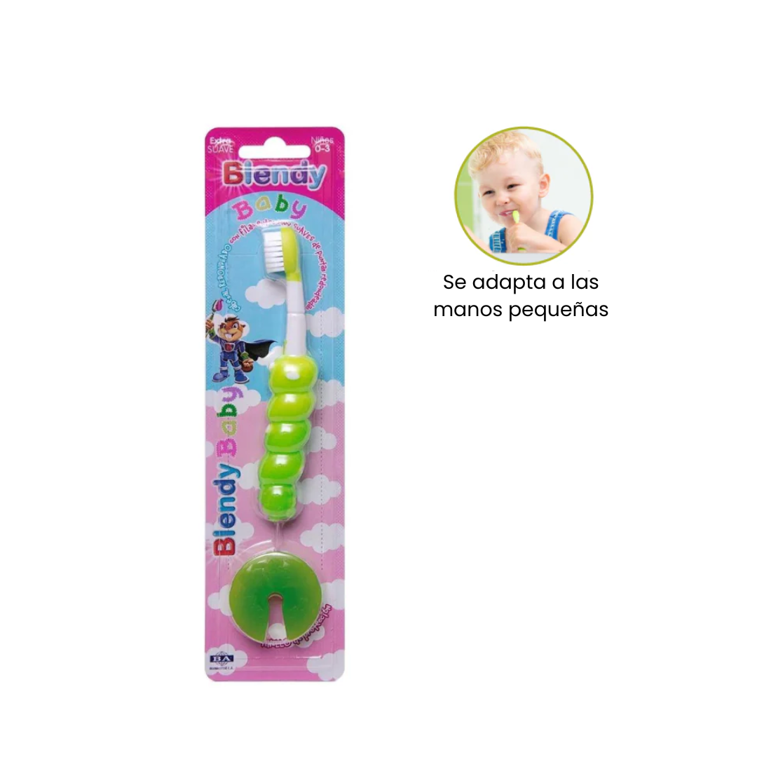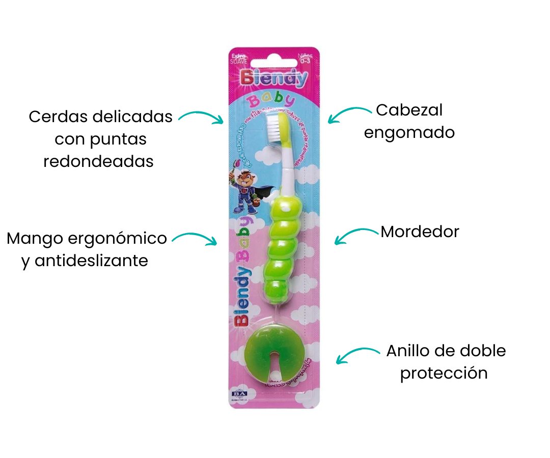 Cepillo con filamentos extra suaves de puntas redondeadas que no daña las encías. Tiene un pequeño cabezal engomado para acceder con cuidado a la boca del bebé y un anillo de doble protección que lo cuida de golpes y lo aleja del contacto de la superficie contaminada.