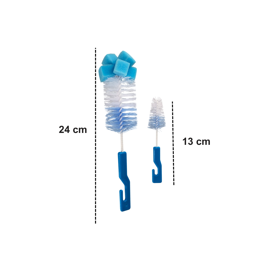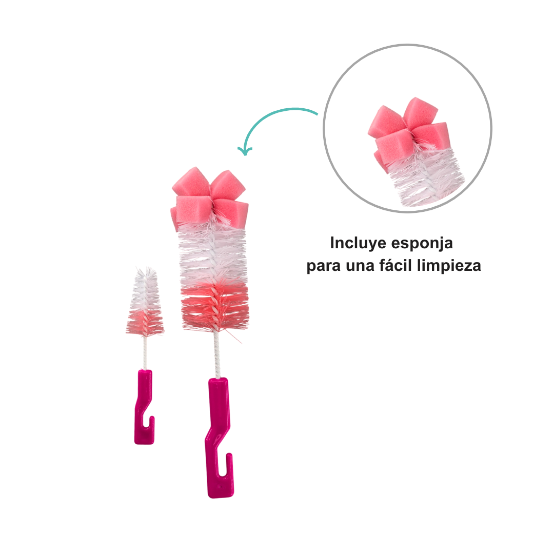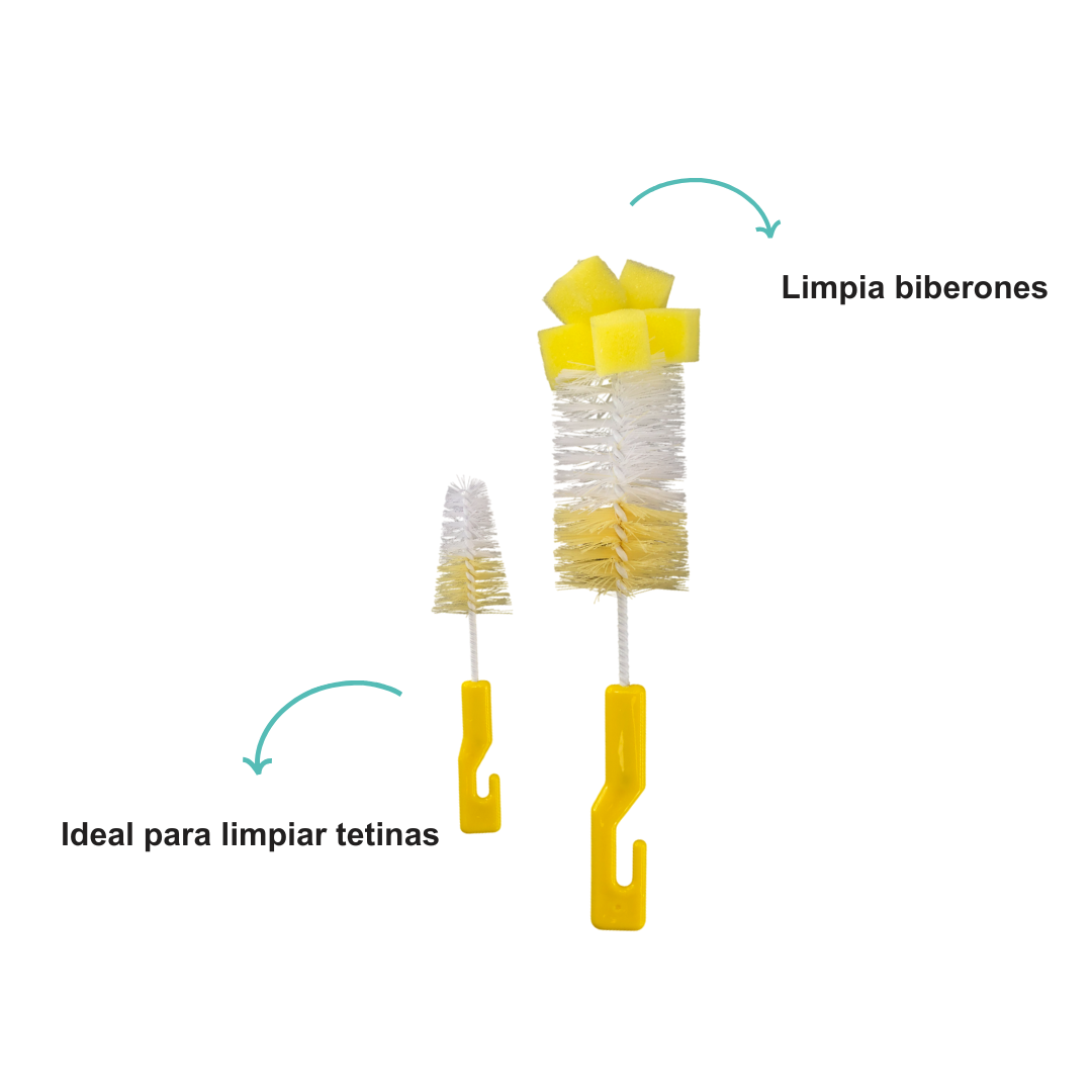 Incluye dos cepillos de diferentes tamaños, uno grande para biberones y uno pequeño ideal para tetinas, asegurando una limpieza profunda y completa de todos los accesorios de alimentación de tu bebé.