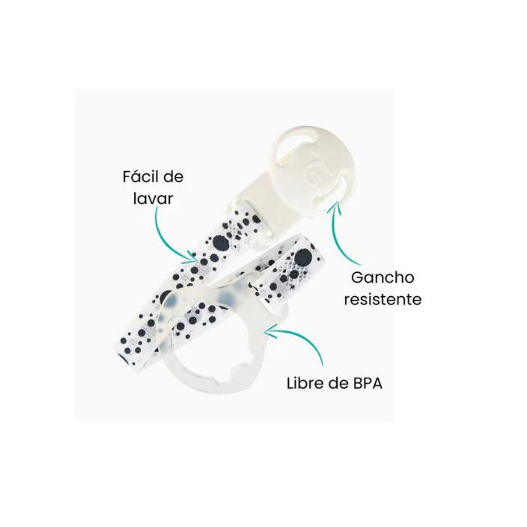 Simplemente conecte el clip del chupete a la ropa de su hijo usando el clip y luego presione el chupete en el otro extremo. Se adapta tanto a los chupetes Twistshakes como a muchos otros gracias al anillo extraíble
