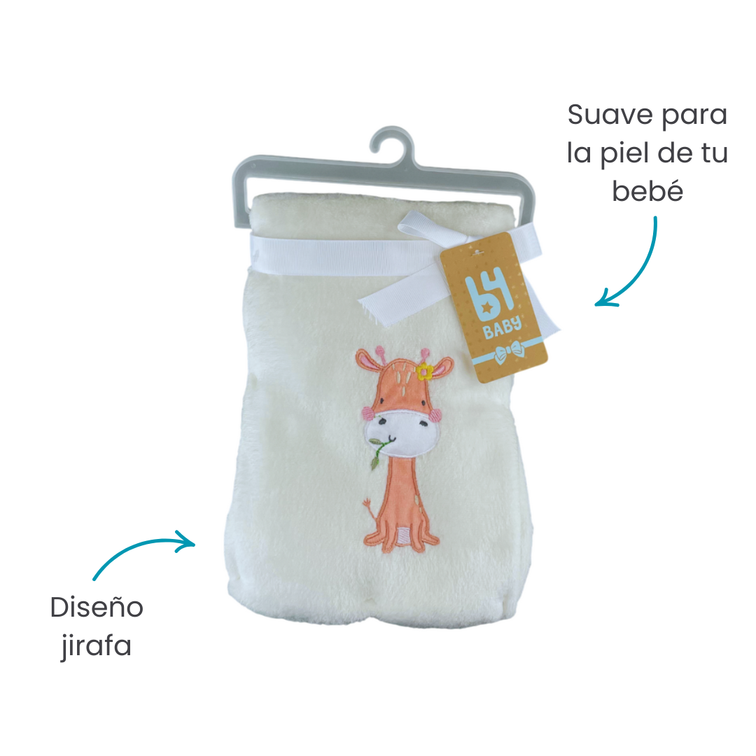 Manta de felpa con diseño de jirafa tiene una medida de 73cm x 90 cm. Ideal para abrigar a tu bebé en todo momento.