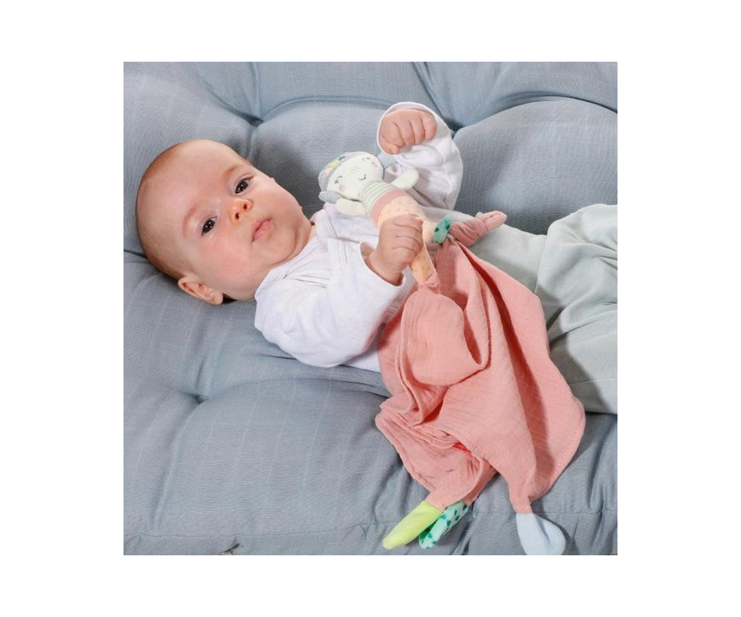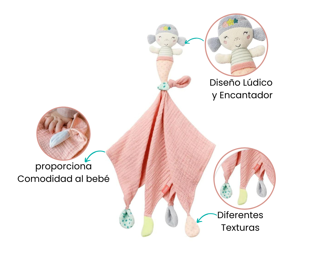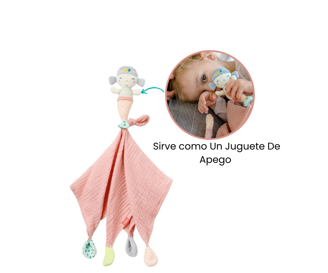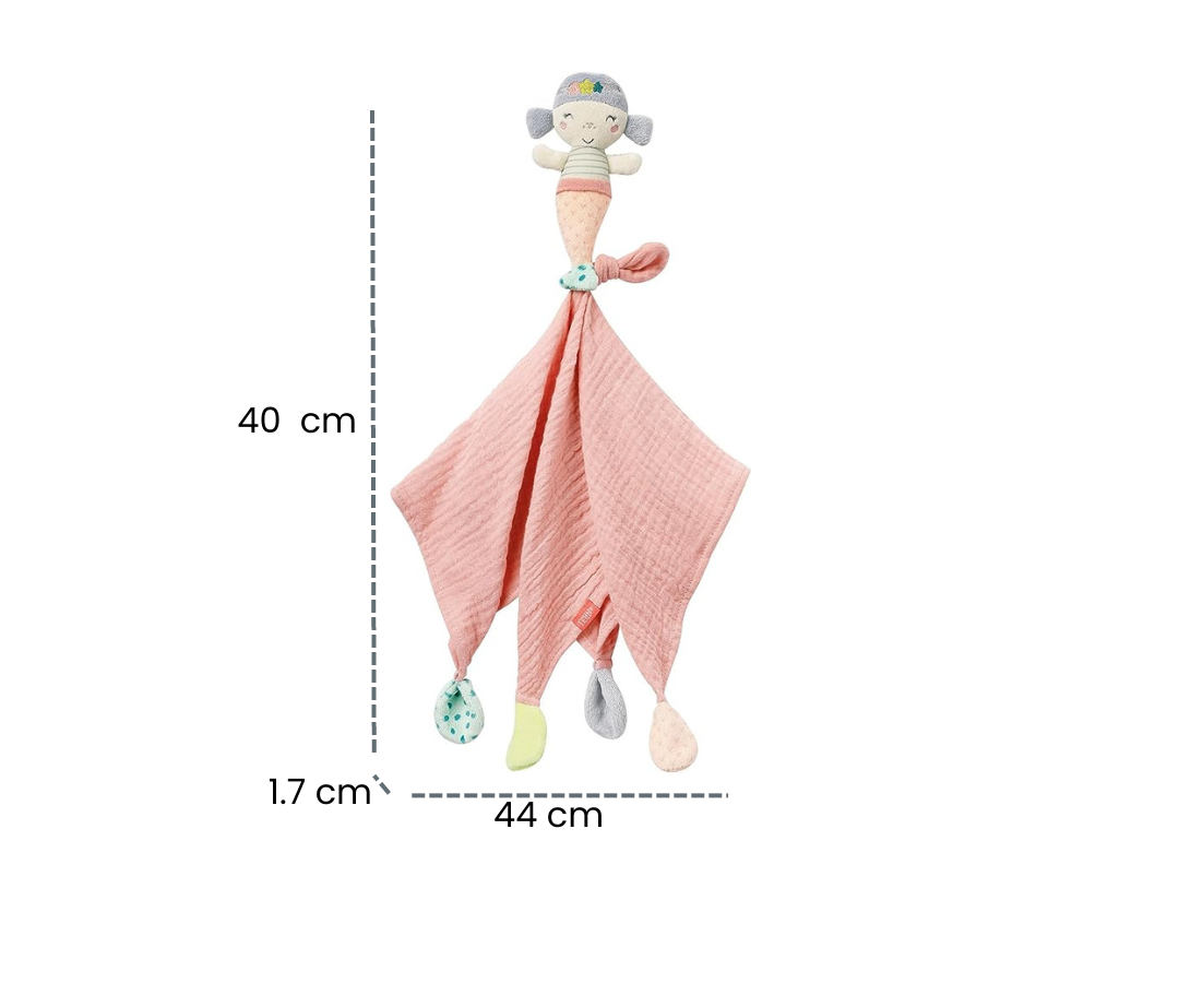 La linda sirena con mantita de la colección Sea Children es una ayuda perfecta para dormir y un tierno amigo para tu bebé. Este pequeño habitante del mar adora los mimos y está feliz de ser la fiel compañera de tu bebé tanto en casa como en los viajes. Cuando el bebé se queda dormido, la tela de muselina de algodón le brinda una sensación de seguridad. Los materiales suaves y tiernos de la sirenita, junto con sus extremos anudados, invitan a agarrar, sentir y abrazar, proporcionando consuelo y calidez.