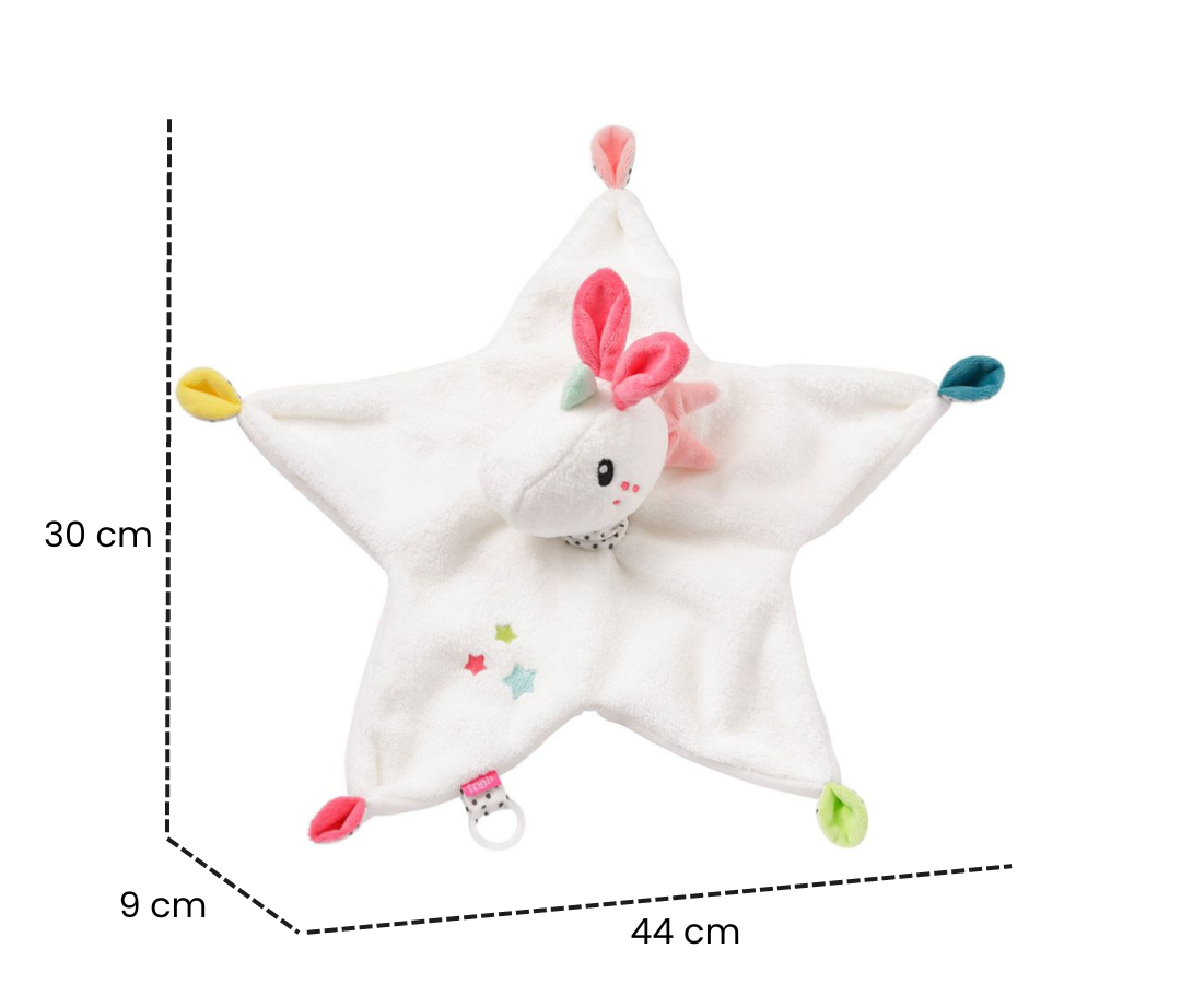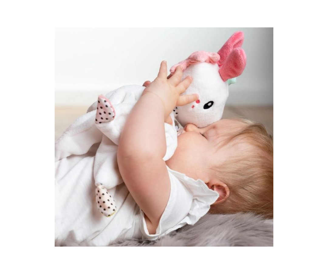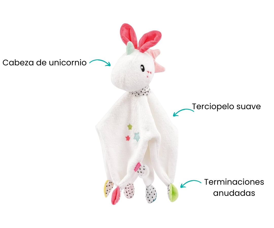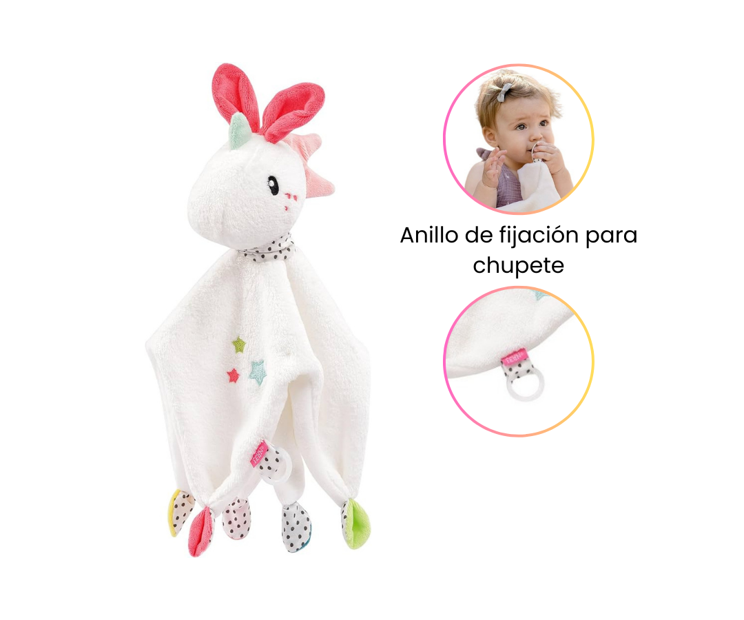 El material suave, la cabeza del unicornio y las terminaciones anudadas invitan a agarrar, sentir y acurrucarse para que la manta sea una gran compañera en casa y fuera de ella. El anillo de silicona flexible se puede acoplar fácilmente a chupetes con y sin asas, para que el chupete no se pierda en las aventuras del bebé.