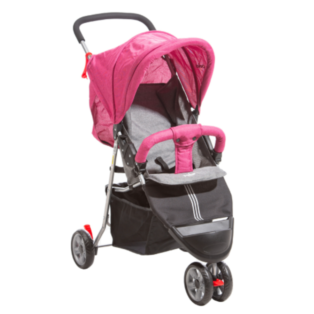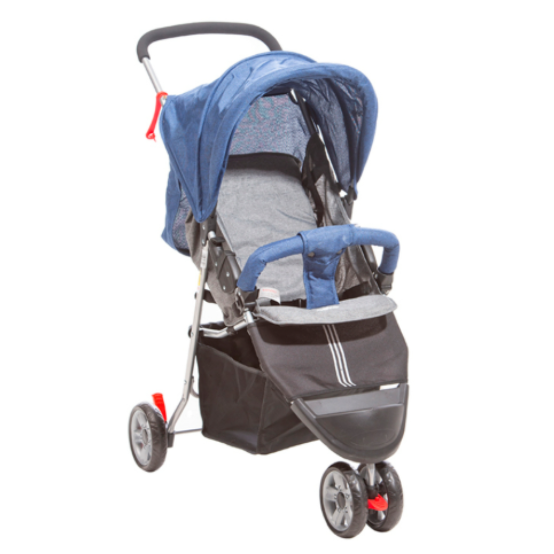 Coche liviano y compacto de 3 ruedas, arnés de seguridad de 2 puntos, espaldar reclinable para una mayor comodidad y protección, uso recomendado hasta lo 15 kg aproximadamente.