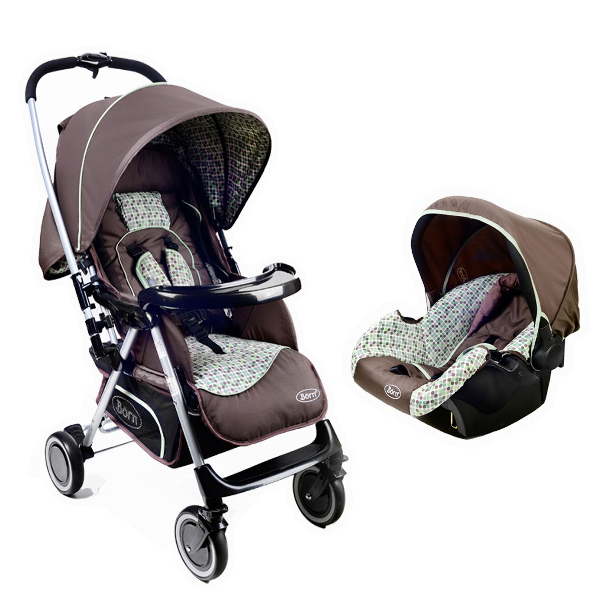 Ruedas delanteras que giran a 60 grados Frenos en 4 ruedas Canasta inferior amplia para llevar múltiples objetos Reposa pies Reclinación total, apta para recién nacidos Bandeja para el bebé Bandeja para los papás Amplio toldo para protección de los rayos UV Confeccionado con materiales fáciles de limpiar Plegado fácil Cinturón de seguridad Peso máximo recomendado 40 lbs