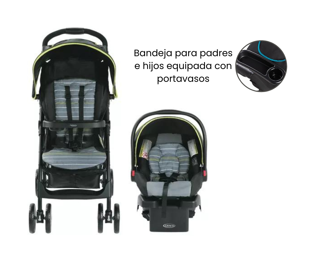 Cuenta con una bandeja para padres, equipada con portavasos y almacenamiento, garantizando que los elementos esenciales estén siempre al alcance. La bandeja para niños es extraíble y con portavasos, lo que permitir una entrada sin complicaciones en el cochecito.