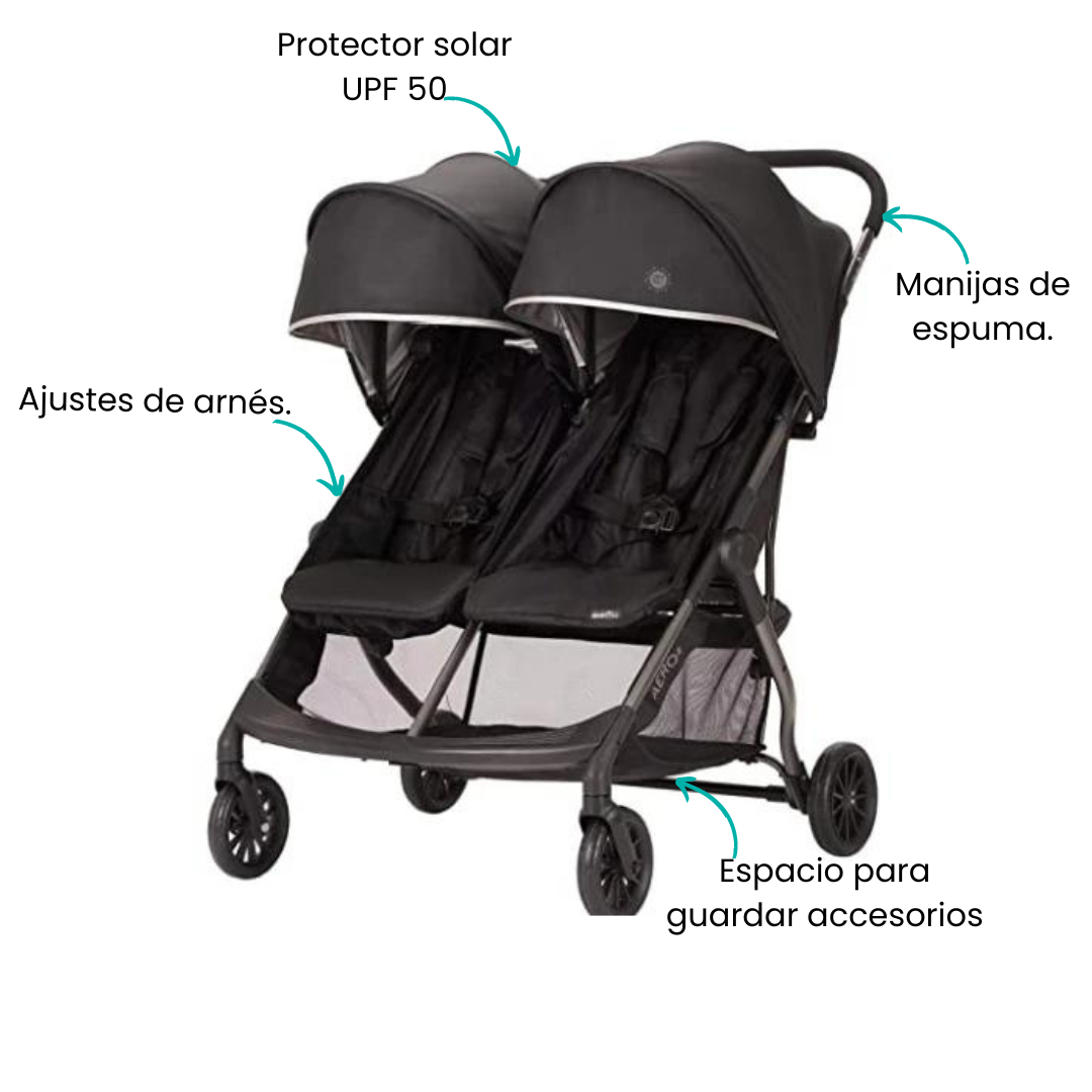 Ofreciendo funcionalidad y portabilidad, el cochecito doble ultraligero Evenflo Aero2 cuenta con una canasta de compras única para maximizar las opciones de almacenamiento cuando viajas con un niño. Esta cesta adicional se puede fijar a la parte delantera de cualquier asiento y se almacena debajo del asiento cuando no está en uso. El plegado rápido y compacto del Aero2 se adapta a espacios más pequeños, simplemente levanta las asas en el asiento para un plegado rápido y fácil. El cochecito plegado se sostiene convenientemente para simplificar su entrada y salida de tu vehículo. Las opciones de almacenamiento adicionales incluyen 2 bolsillos de almacenamiento en el respaldo del asiento perfectos para teléfonos o carteras, y una cesta de almacenamiento extragrande con acceso frontal y trasero.
