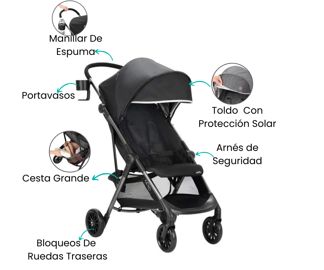 para Evenflo se enorgullece en presentar el cochecito ultraligero Aero, diseñado con la colaboración directa de padres como tú para satisfacer las demandas del uso diario. Con su construcción innovadora y materiales de alta calidad, el Aero ofrece una experiencia de paseo sin complicaciones. Desde su fácil manejo hasta su plegado compacto, cada detalle ha sido cuidadosamente pensado para simplificar tu vida cotidiana.
