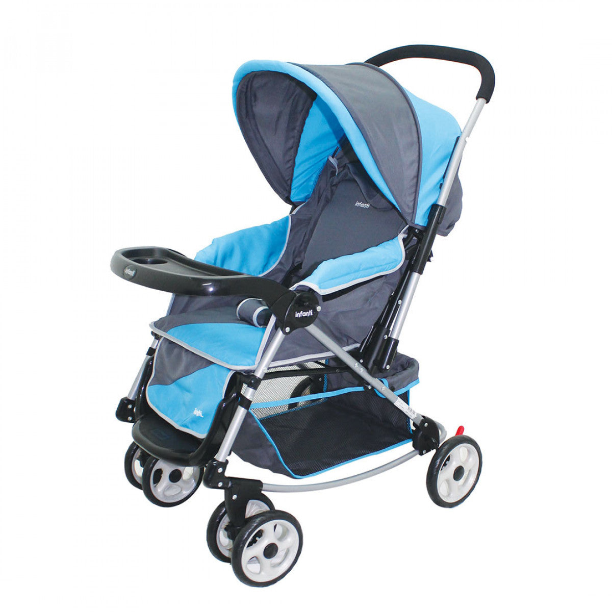 Tiene Bandeja frontal, se transforma en mecedora con posiciones de reclinación Tiene un seguro que ayuda a proteger de no cerrarse cuando está en uso Su tela es desmontable y lavable Manija reversible