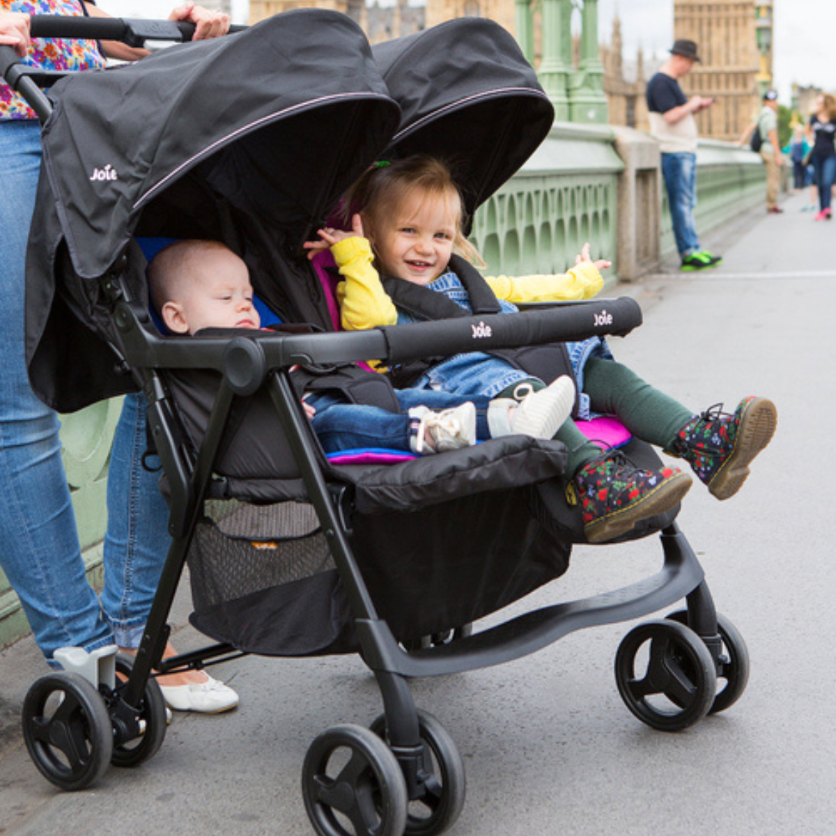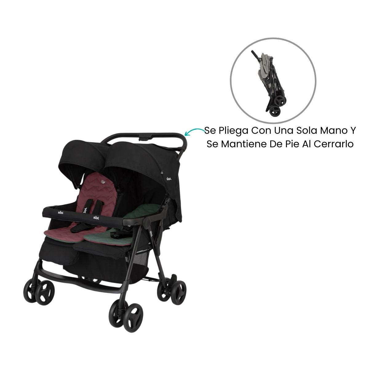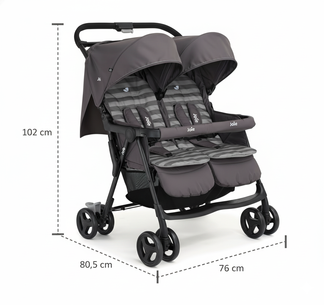 Pensado para simplificar la rutina diaria, el coche doble Joie se pliega con una sola mano y se mantiene de pie al cerrarlo, facilitando su almacenamiento. Con un peso menor a 12 kg, es fácil de maniobrar incluso en espacios reducidos. Su suspensión en las cuatro ruedas y las capotas con protección UPF 50+ garantizan un paseo suave y protegido en cualquier terreno, mientras que la amplia cesta doble permite llevar todo lo que tus pequeños y tú necesitan en cada salida.