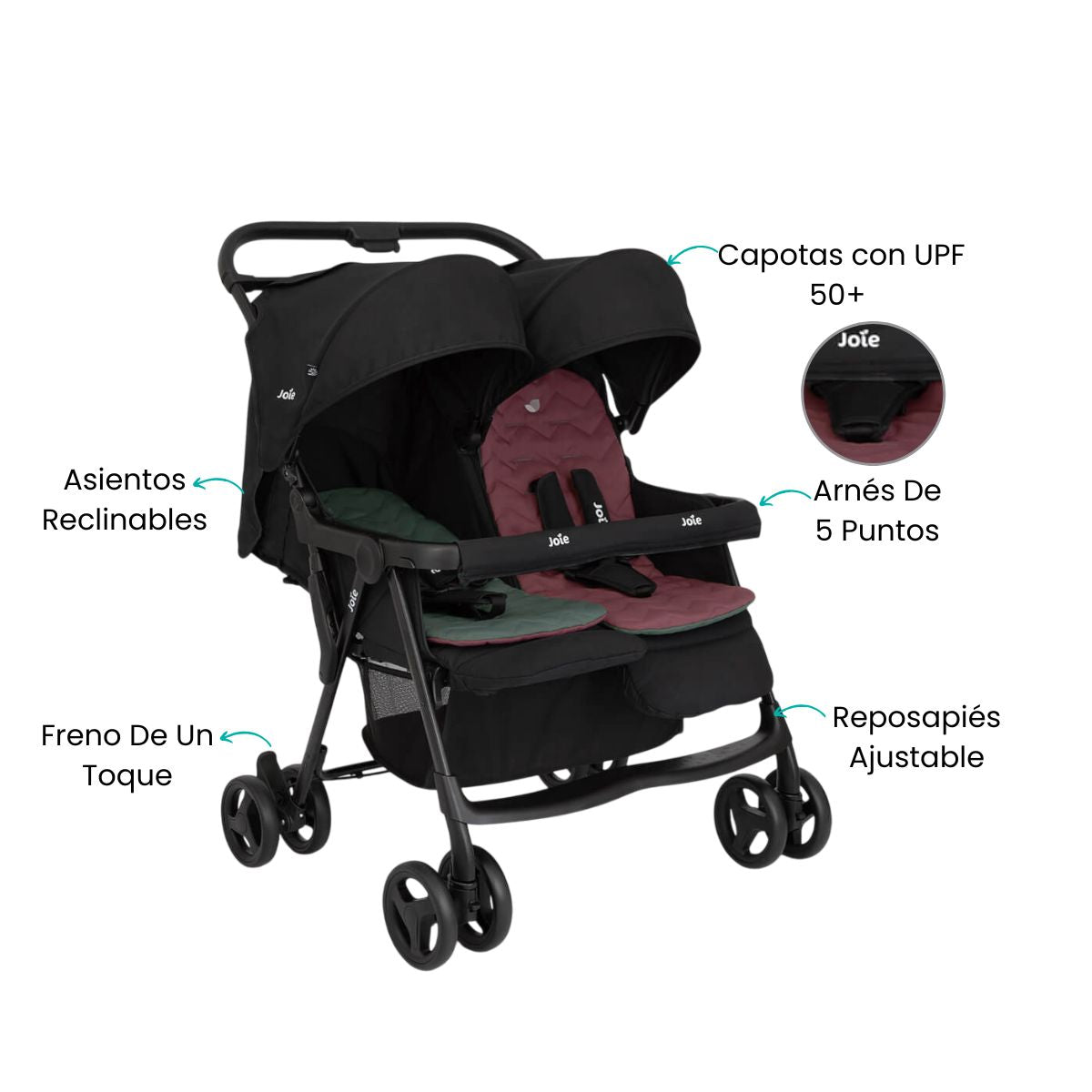 El cochecito doble Joie combina ligereza, seguridad y comodidad para que tus pequeños viajen felices, ofreciendo un diseño moderno y práctico ideal para familias con gemelos o hermanos cercanos.