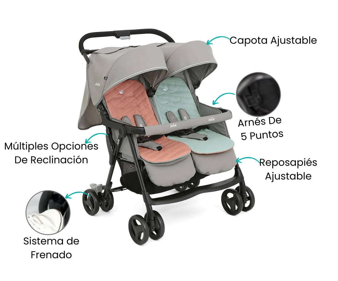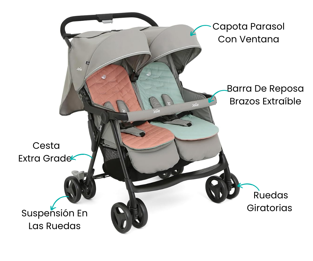 Descubre la excelencia en movilidad con el Coche Doble Aire Twin, que combina un chasis ligero de aluminio con un diseño intuitivo para hacer que cada paseo sea un placer. Con su reclinado total, es ideal desde el nacimiento, brindando a tus pequeños un espacio seguro y cómodo desde el primer día. Su fácil maniobrabilidad garantiza una experiencia sin complicaciones para padres ocupados.