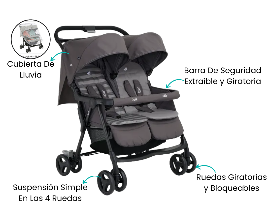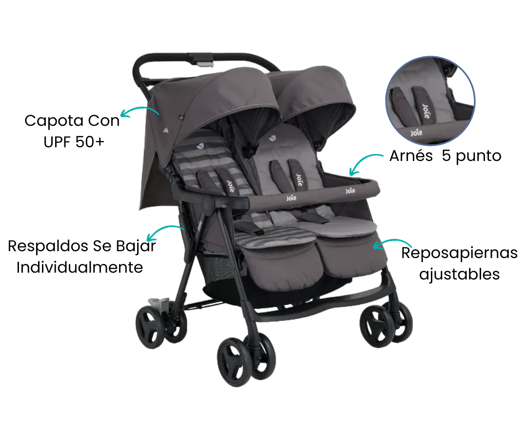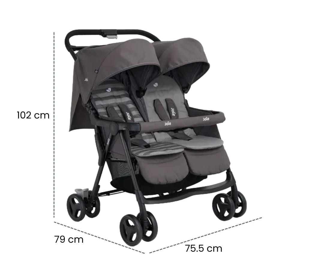 La silla de paseo gemela Aire Twin de Joie, con su elegante diseño en gris Dark Pewter, es la compañera ideal en la vida cotidiana para hermanos o niños de diferentes edades, soportando hasta aproximadamente 15 kg de peso cada uno. Su estructura doble proporciona comodidad y estilo, mientras que su diseño compacto garantiza la maniobrabilidad en diversas situaciones.